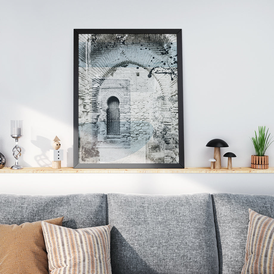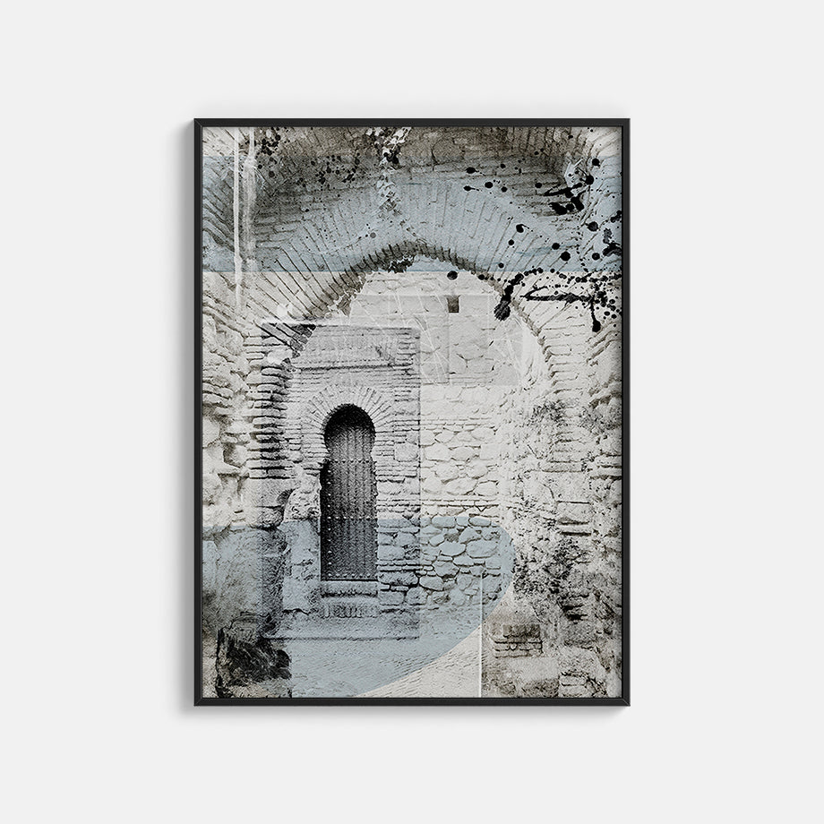 Arte de Málaga. La serenidad de la arquitectura histórica de Málaga. El uso de acuarelas y la técnica de salpicaduras de tinta le otorgan a la imagen una cualidad artística y abstracta, añadiendo una dimensión contemporánea a esta imagen de la Alcazaba de Málaga.