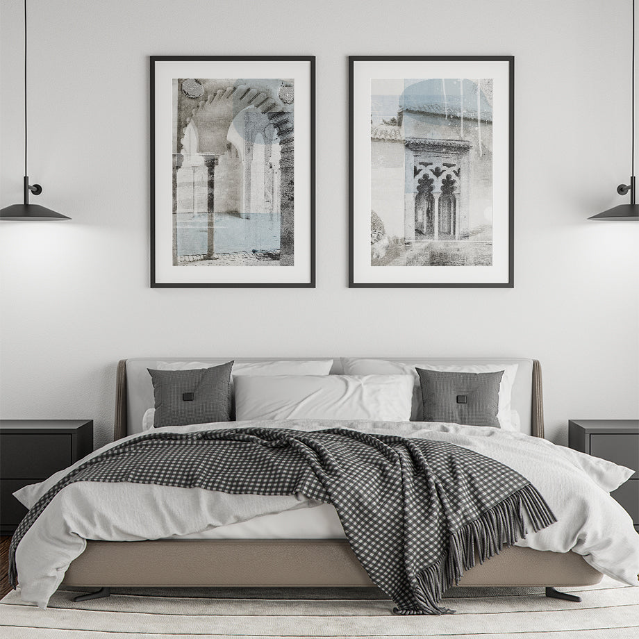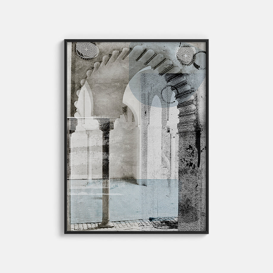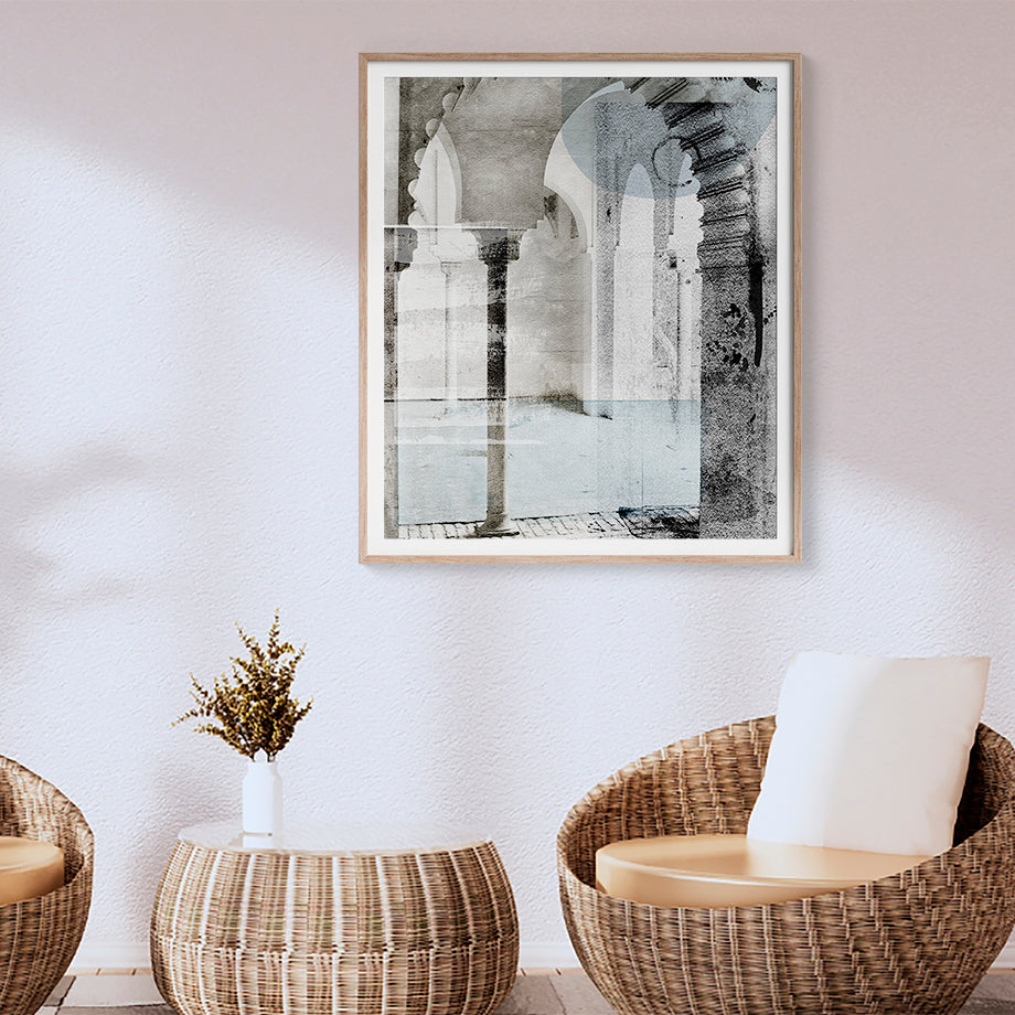 Arte de Málaga. La serenidad de la arquitectura histórica de Málaga. El uso de acuarelas y la técnica de salpicaduras de tinta le otorgan a la imagen una cualidad artística y abstracta, añadiendo una dimensión contemporánea a esta imagen de la Alcazaba de Málaga.
