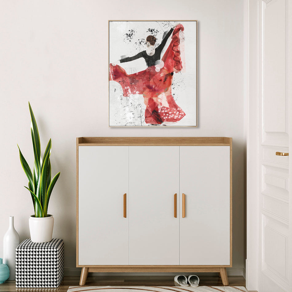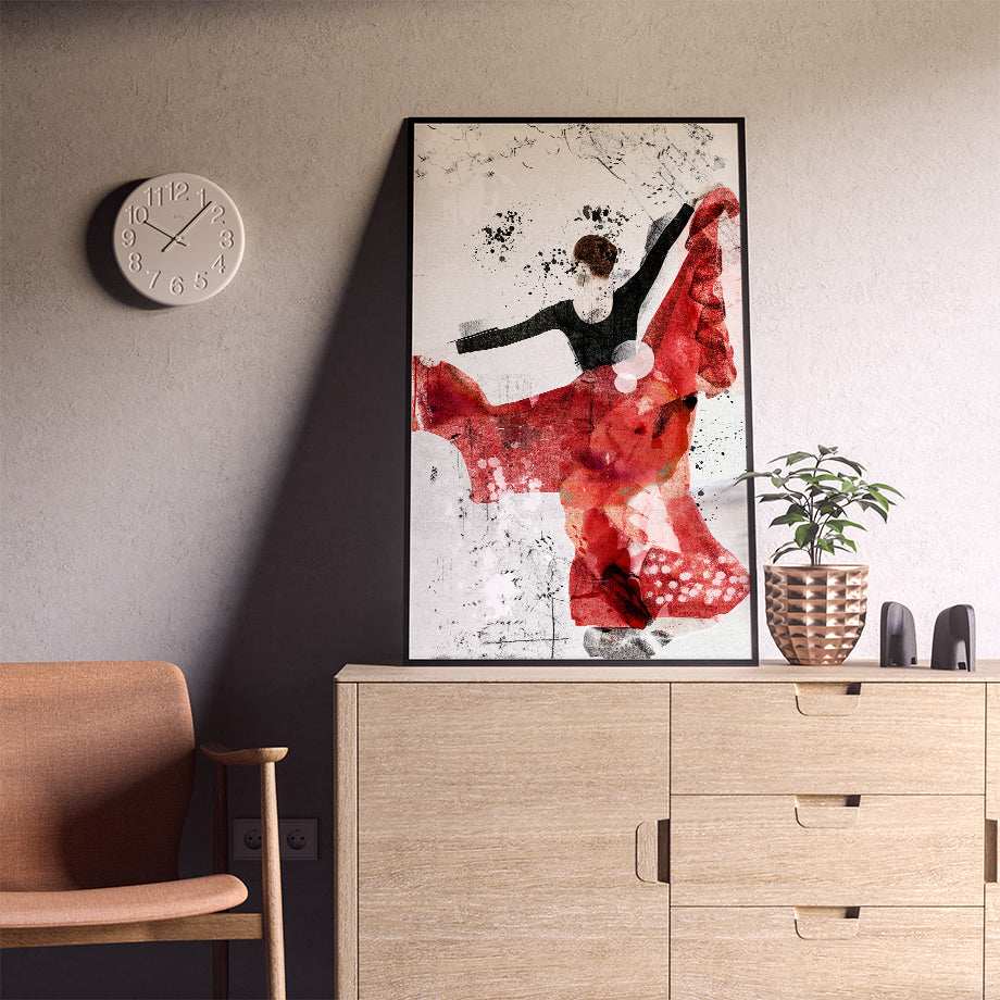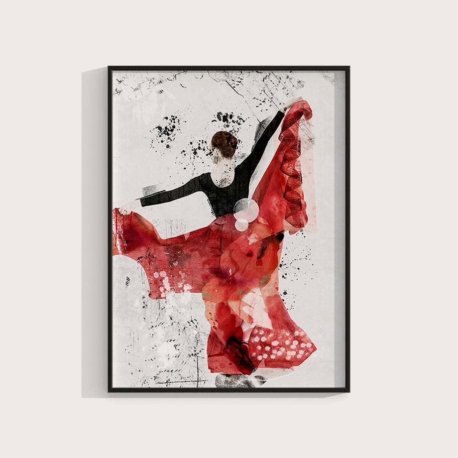 Este cuadro captura la esencia vibrante y apasionada del flamenco a través de una impresionante imagen de una bailaora en pleno movimiento. La falda roja, con su movimiento fluido, se convierte en el punto focal de la obra, contrastando de manera espectacular con el fondo abstracto en tonos de blanco y negro.