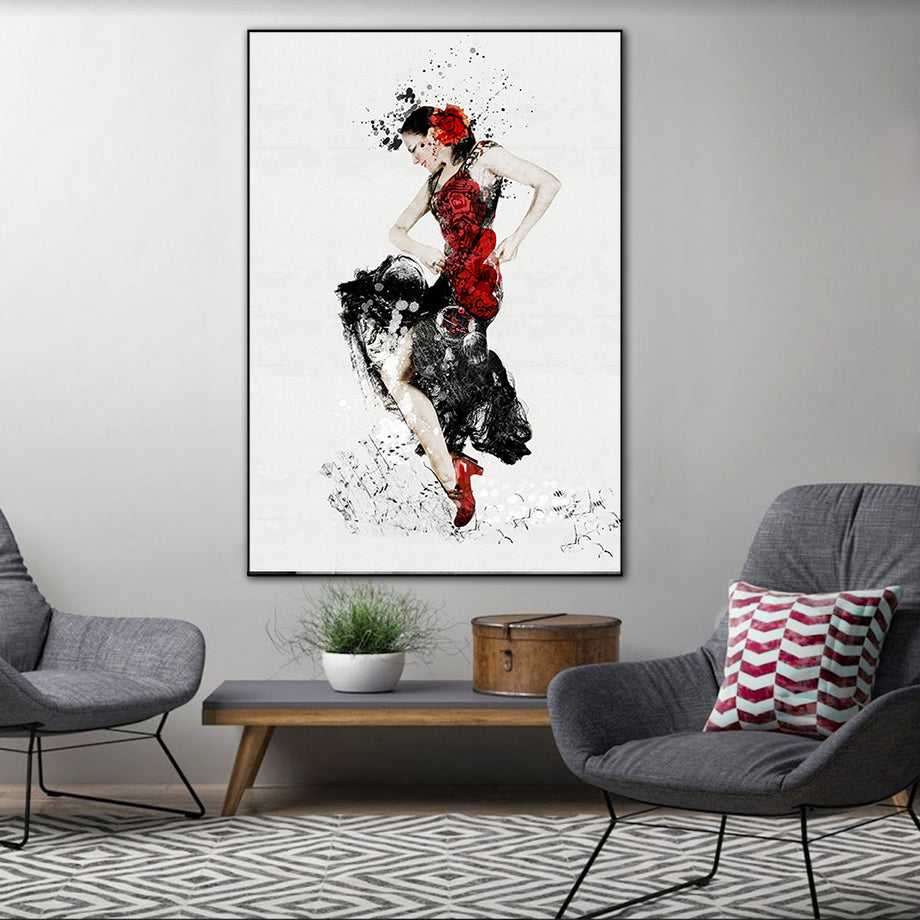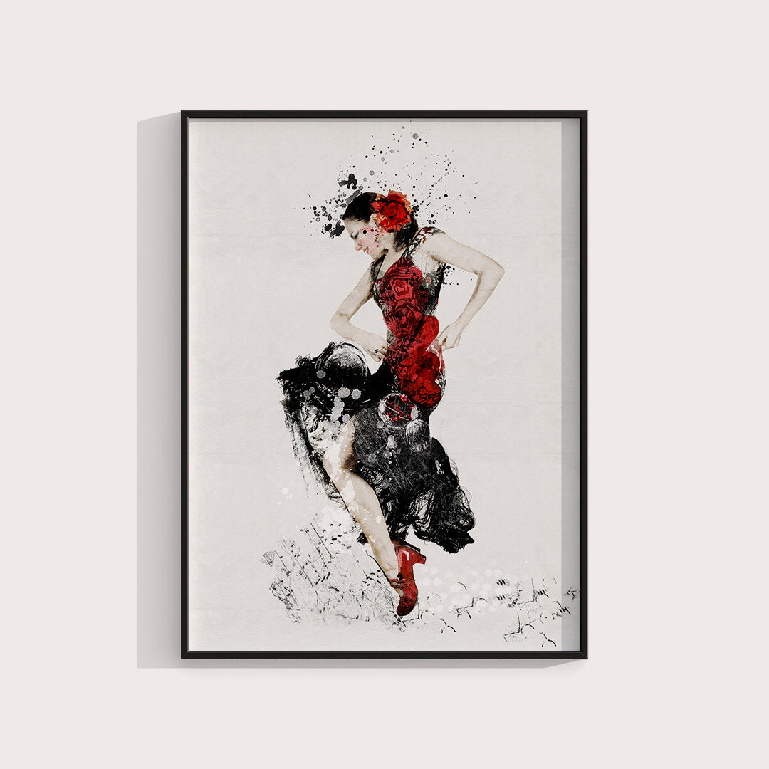 Este cuadro dinámico captura la esencia vibrante del baile flamenco a través de una bailaora en una pose expresiva. La bailaora, vestida con un elegante vestido rojo y negro con un patrón floral y zapatos rojos a juego, parece estar en medio de un giro lleno de energía. El fondo blanco y la técnica de pintura salpicada aportan una sensación de movimiento y vitalidad, haciendo que la imagen cobre vida ante los ojos del espectador.