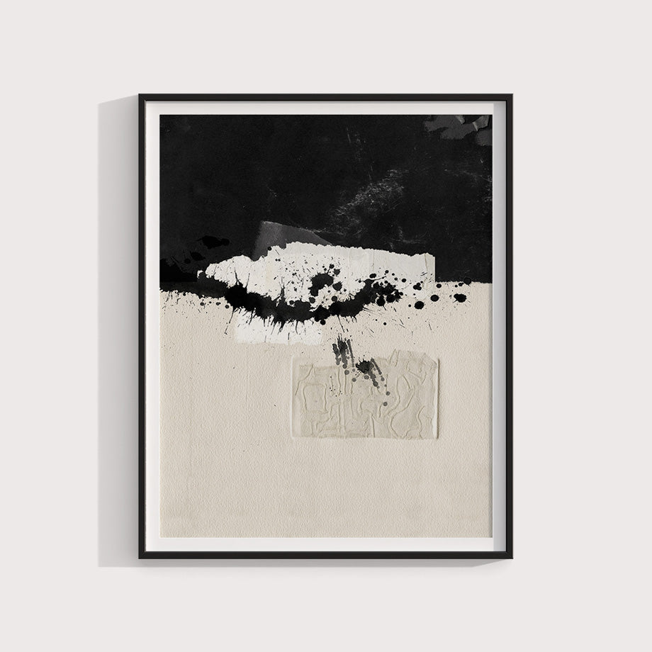 Este cuadro abstracto es una combinación de texturas y contrastes que c rea una composición visualmente impactante y dinámica. En la parte superior una zona negra texturada y debajo un trozo de papel blanco rasgado con manchas y salpicaduras de tinta negra. y un patrón en relieve.