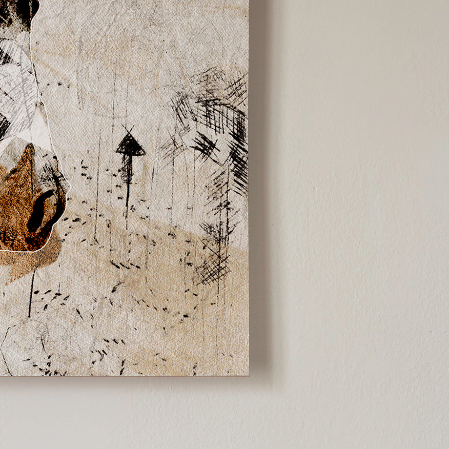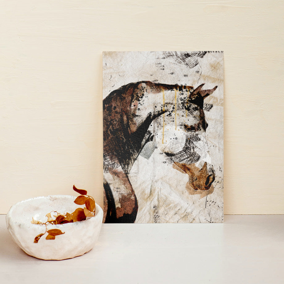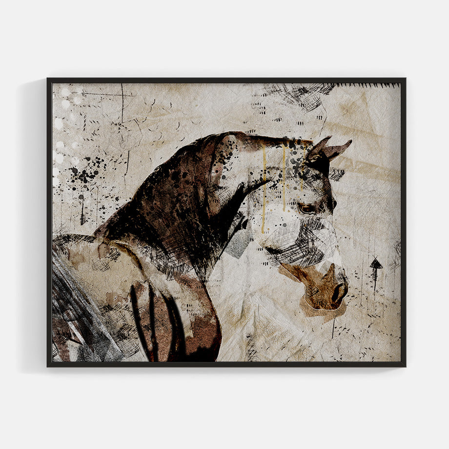 Este cuadro captura la majestuosidad y la gracia de un caballo, ilustrado en un estilo de medios mixtos que combina elementos de dibujo, pintura y fotografía.El fondo texturizado con diversos patrones y salpicaduras añade profundidad y complejidad a la pieza, haciendo que el caballo destaque de manera espectacular.