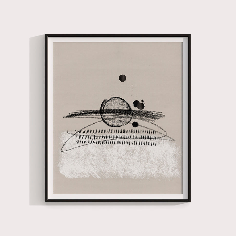 La combinación de elementos negros, blancos y el fondo beige crea un contraste visual atractivo. La sensación de movimiento y energía que emana de las curvas y líneas de grafito hace de esta obra una pieza elegante y serena.
