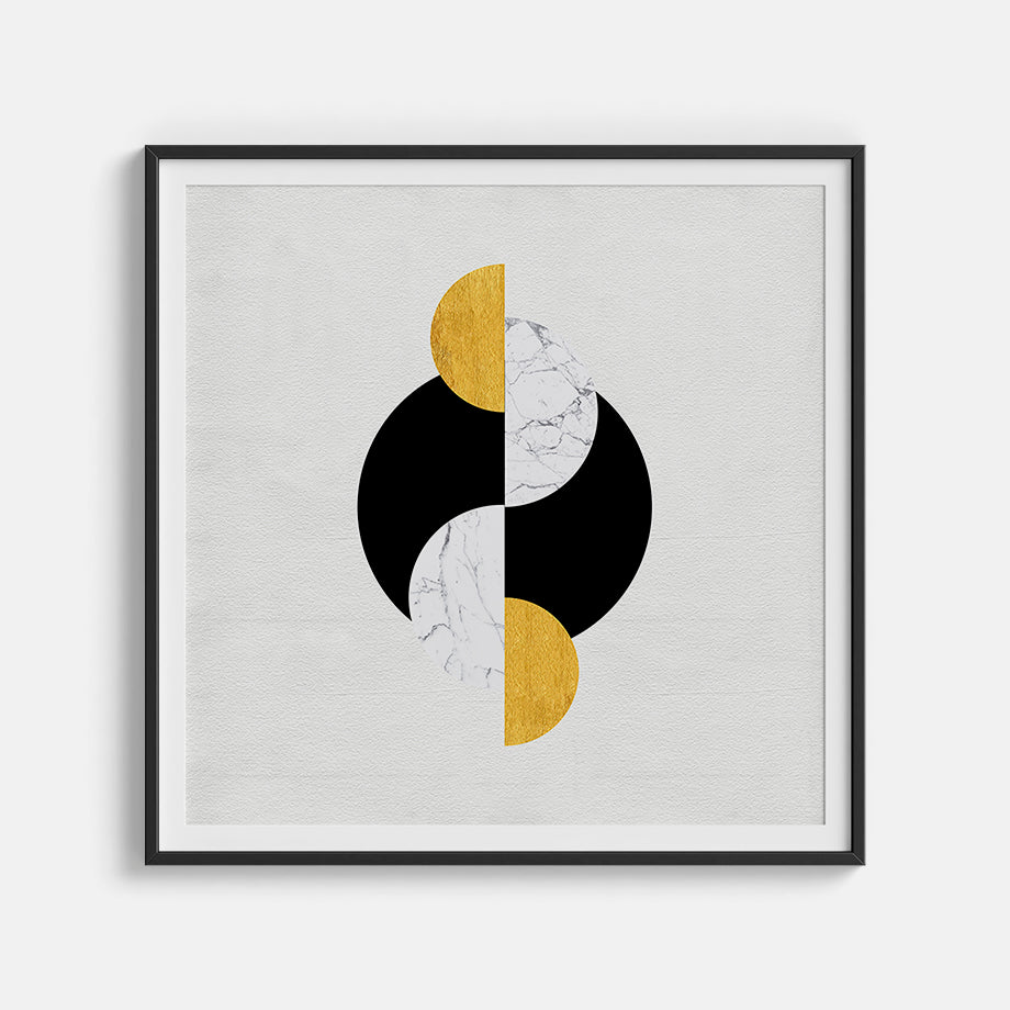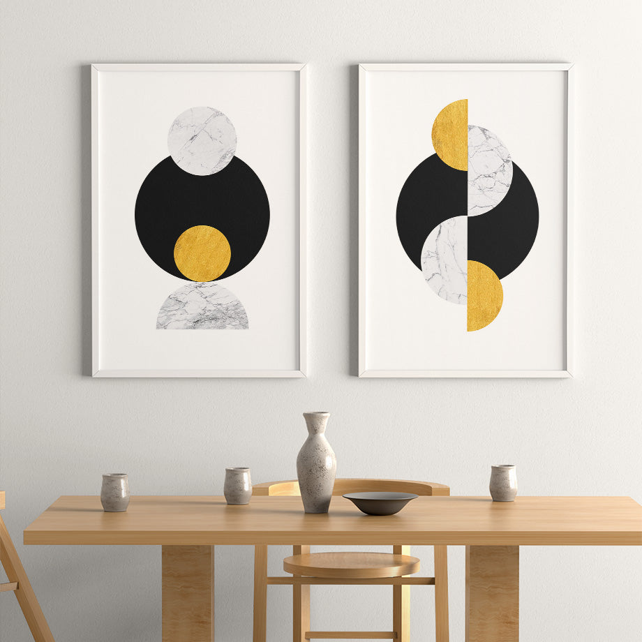 La disposición geométrica de los círculos y el contraste de colores y texturas aportan un toque contemporáneo y elegante. Los tonos de negro, blanco mármol y dorado crean una combinación visualmente atractiva.