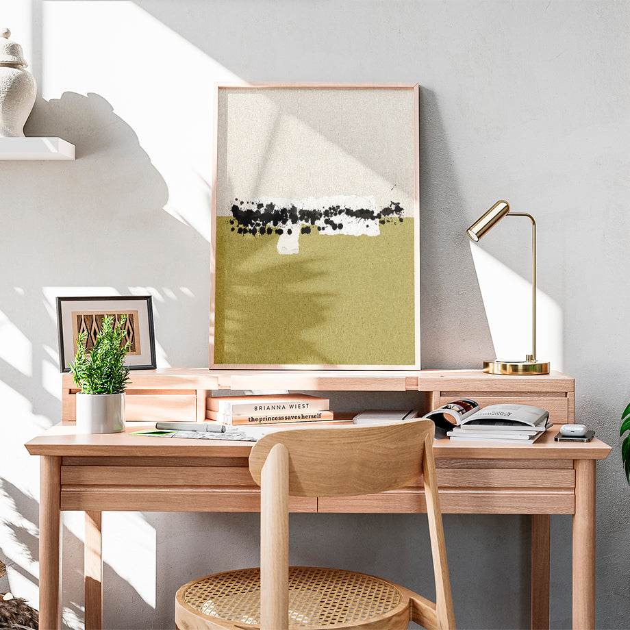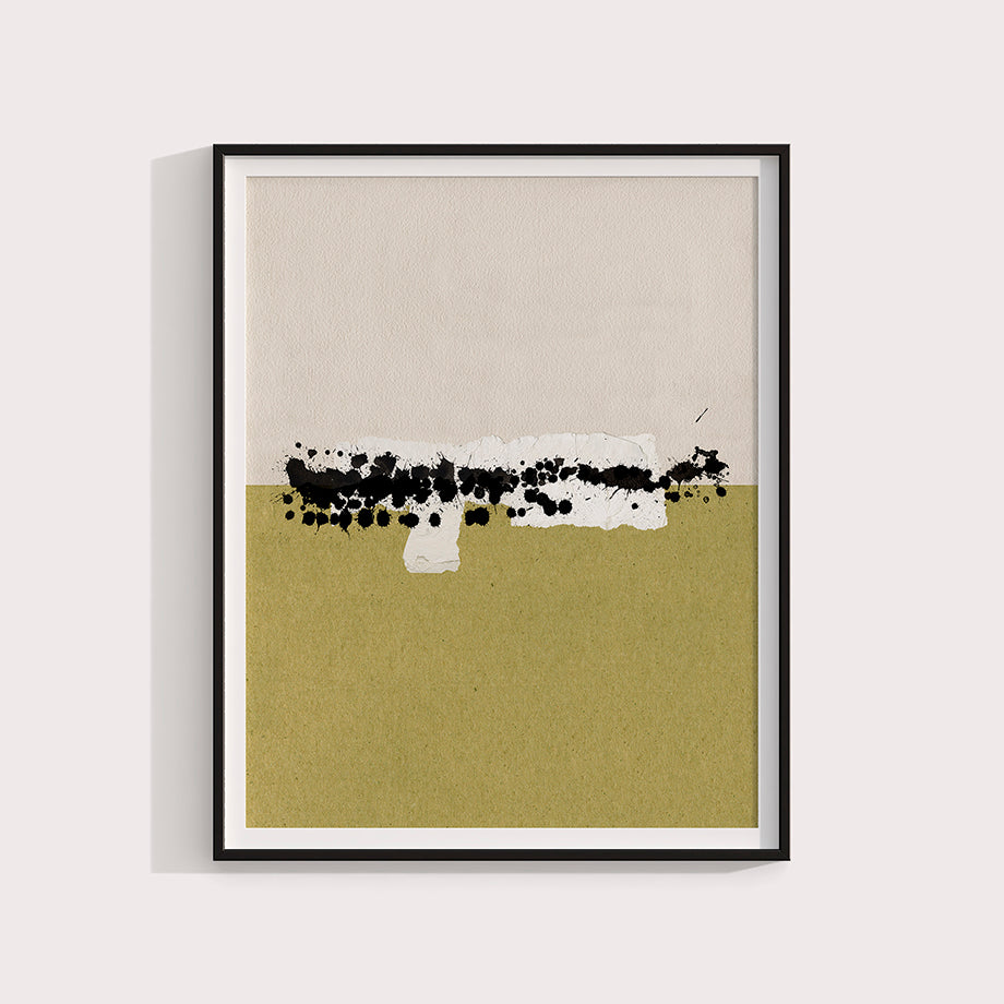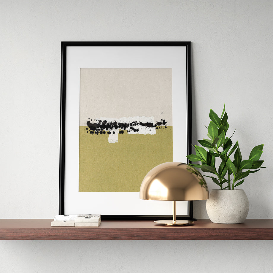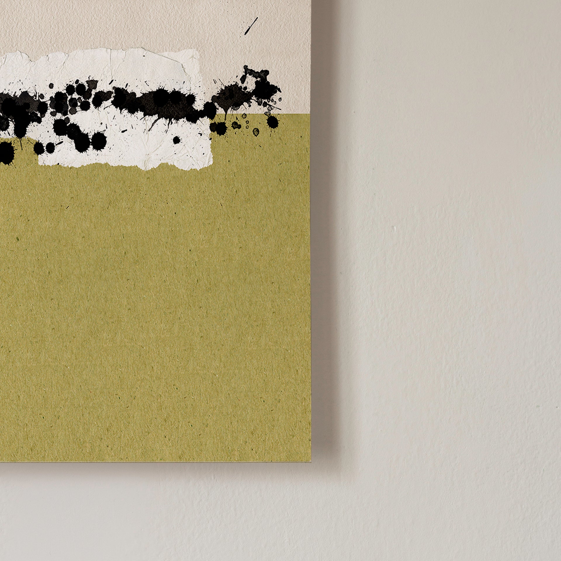 Este cuadro abstracto es una obra contemporánea que juega con los contrastes de color y textura para crear una pieza visualmente impactante. La composición está dividida en dos secciones principales, la parte superior de un color beige claro y la parte inferior de un verde oliva. Ambas secciones están conectadas por una franja horizontal de salpicaduras de tinta negra y trozos de papel , aportándole volumen a la obra.