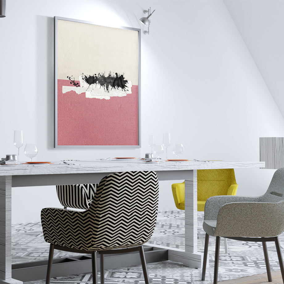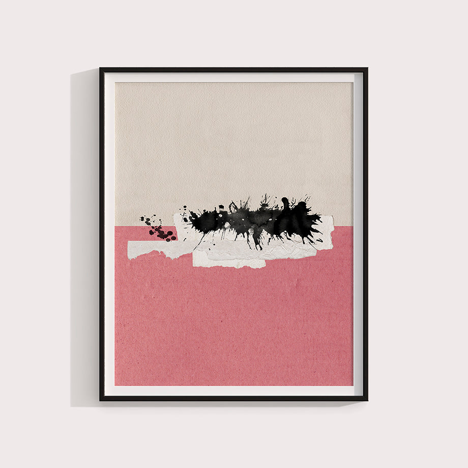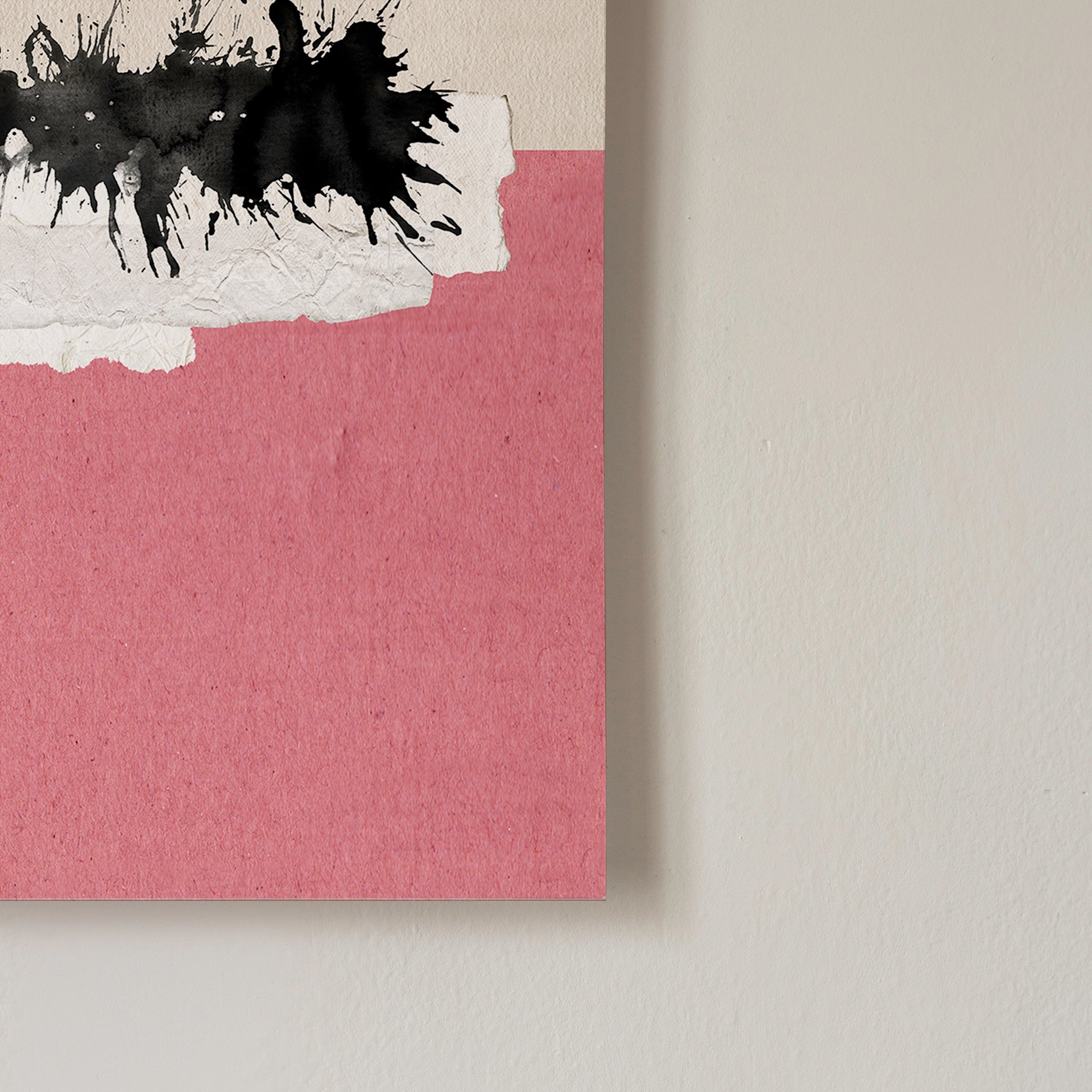 Este cuadro abstracto es una obra contemporánea que juega con los contrastes de color y textura para crear una pieza visualmente impactante.La composición está dividida en dos secciones principales, la parte superior de un color beige claro y la parte inferior de un rosa enpolvado. Ambas secciones están conectadas por una franja horizontal de salpicaduras de tinta negra y trozos de papel, aportándole volumen a la obra.