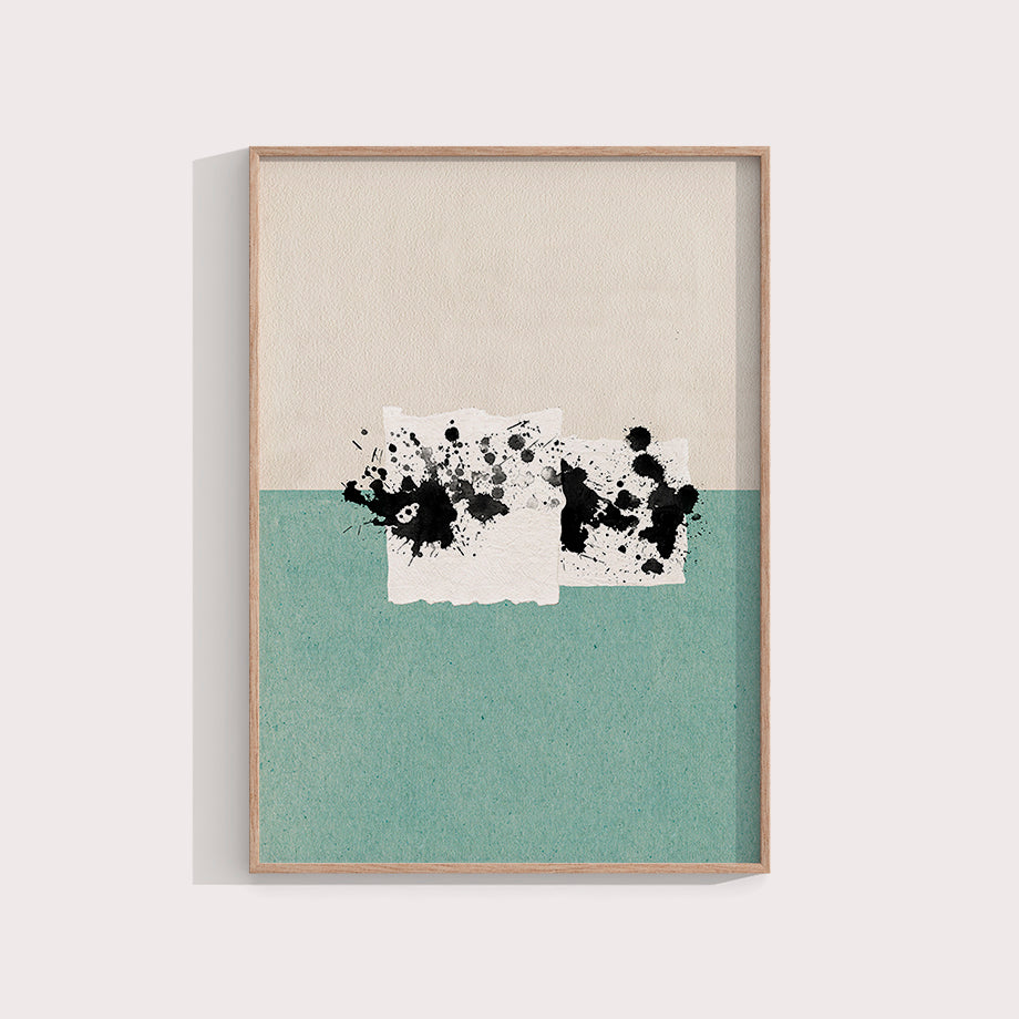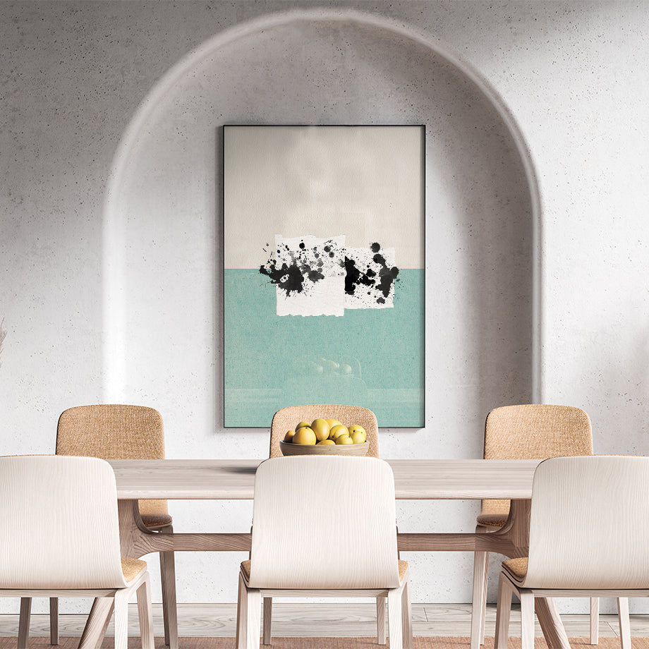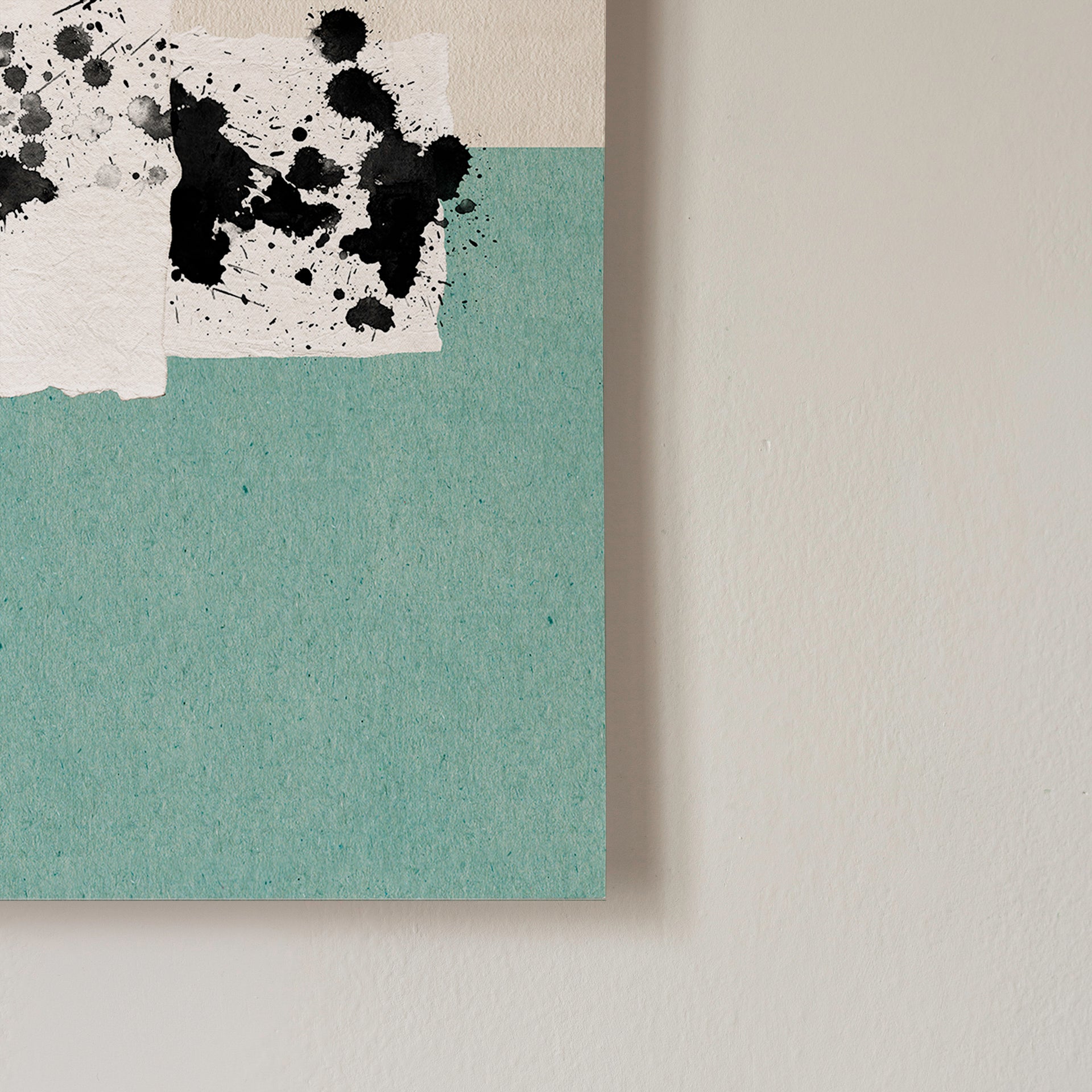 Este cuadro abstracto es una obra contemporánea que juega con los contrastes de color y textura para crear una pieza visualmente impactante.La composición está dividida en dos secciones principales, la parte superior de un color beige claro y la parte inferior de un vibrante turquesa. Ambas secciones están conectadas por una franja horizontal de salpicaduras de tinta negra y trozos de papel, aportándole volumen a la obra.