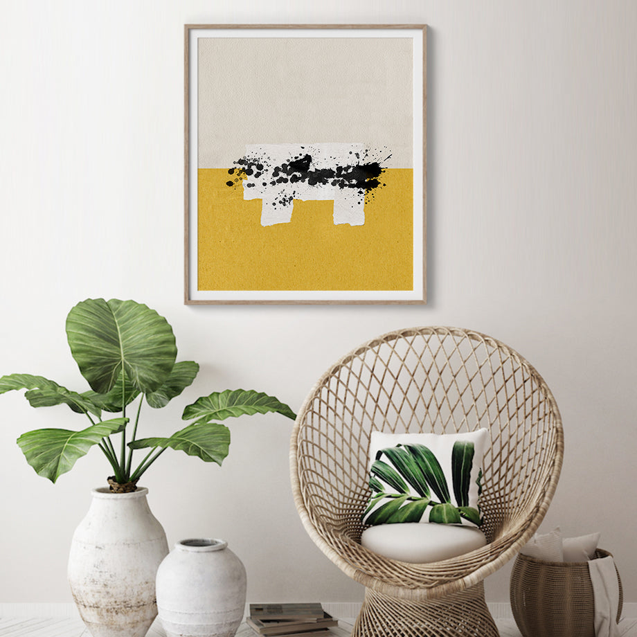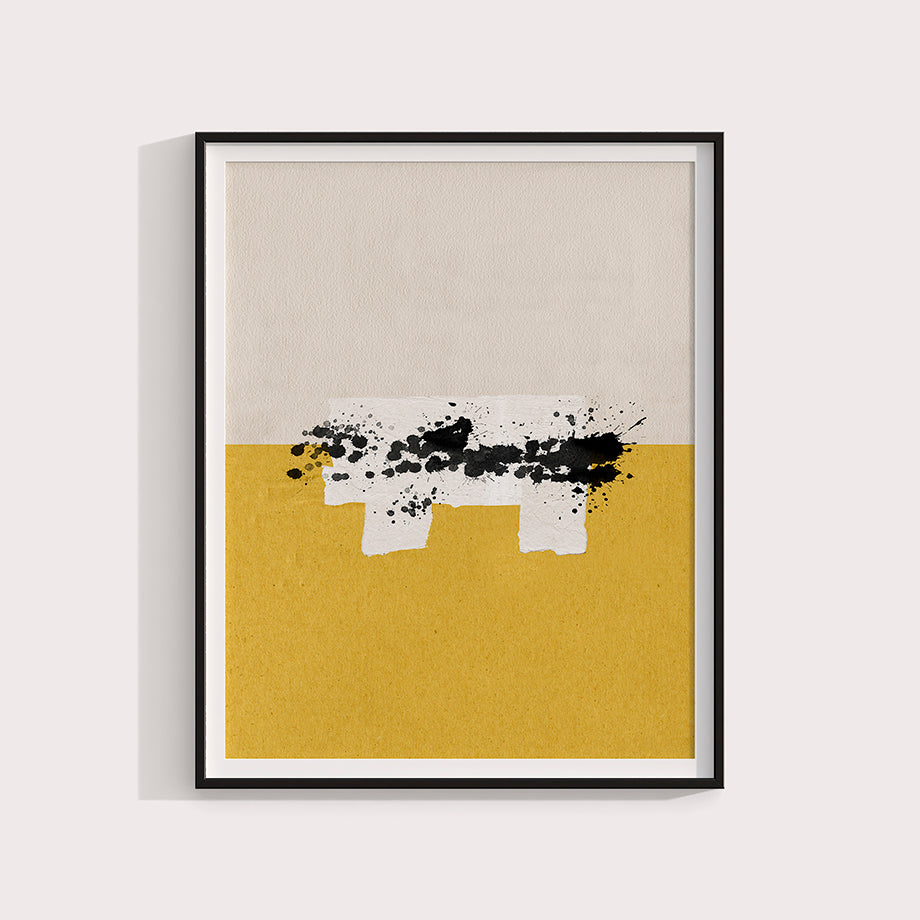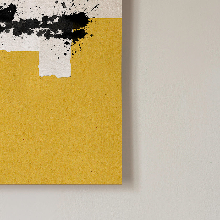Este cuadro abstracto es una obra contemporánea que juega con los contrastes de color y textura para crear una pieza visualmente impactante.La composición está dividida en dos secciones principales, la parte superior de un color beige claro y la parte inferior de un color amarillo. Ambas secciones están conectadas por una franja horizontal de salpicaduras de tinta negra y trozos de papel, aportándole volumen a la obra.