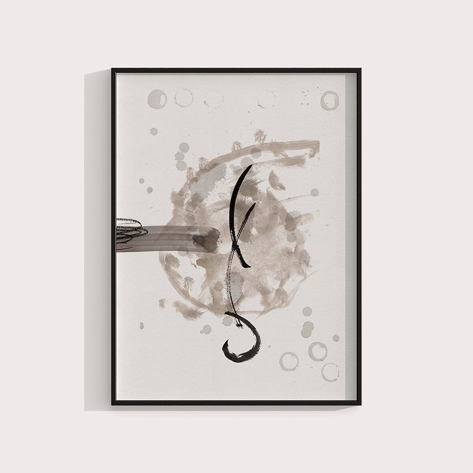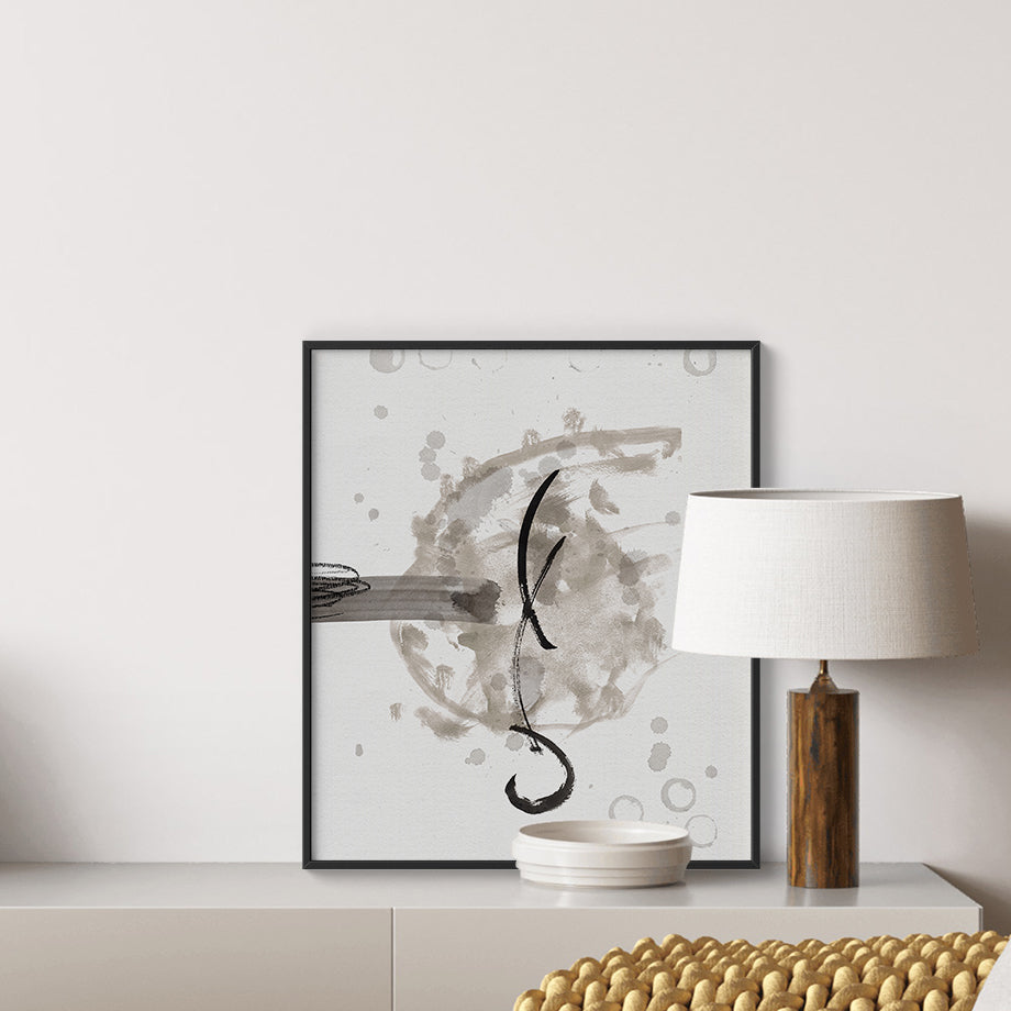 Este cuadro minimalista es una pieza de arte moderno que destaca por su simplicidad y elegancia. Texturas en acuarela y tinta china de tonos de negro y gris sobre un fondo blanco, creando un contraste llamativo y dinámico.