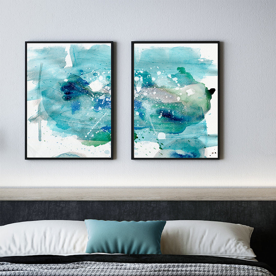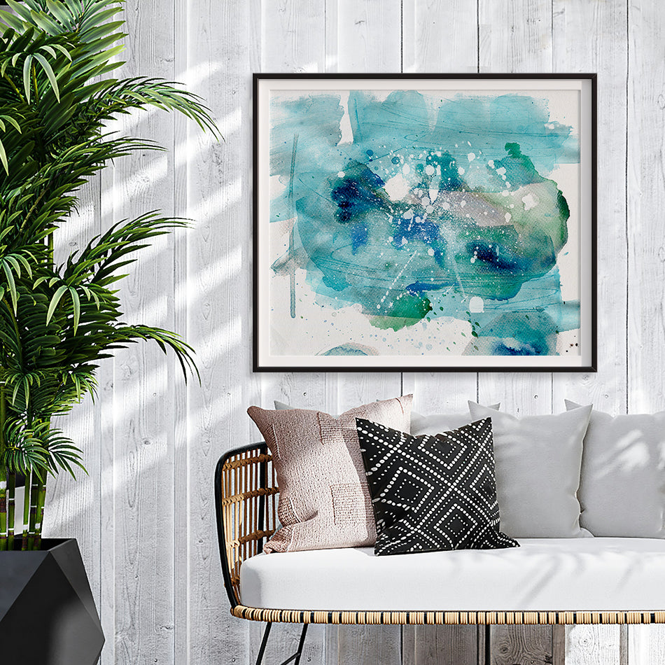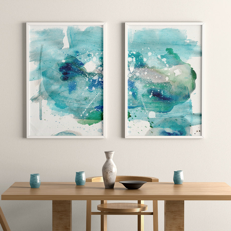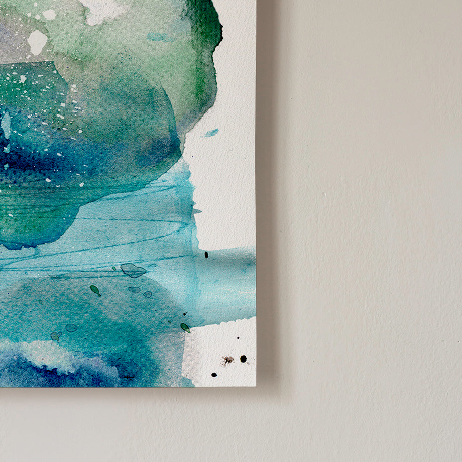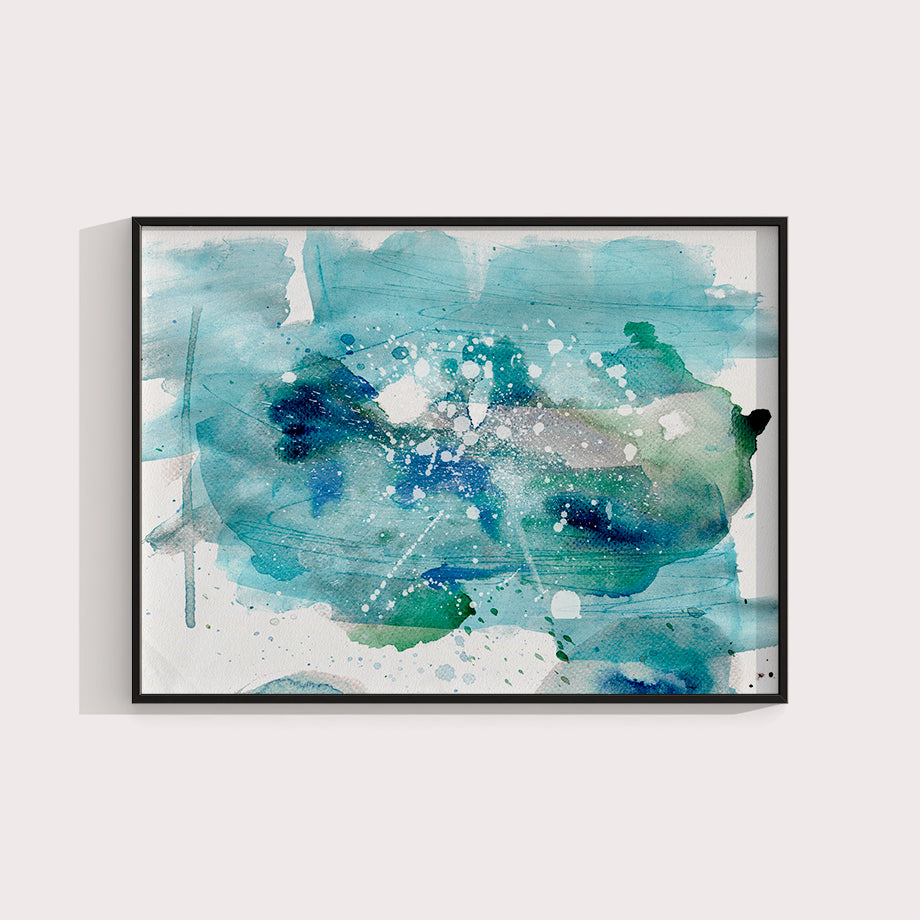 Este cuadro abstracto en acuarela presenta una vibrante mezcla de tonos azules y verdes con salpicaduras y manchas de pintura blanca que se distribuyen dinámicamente por el lienzo.