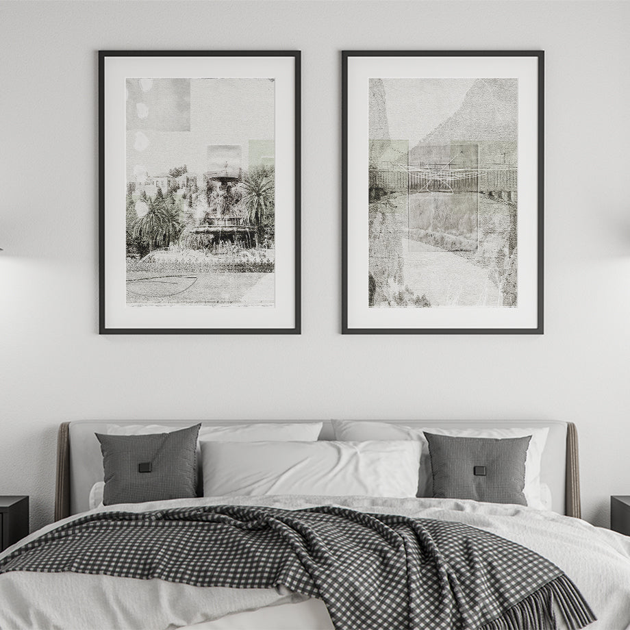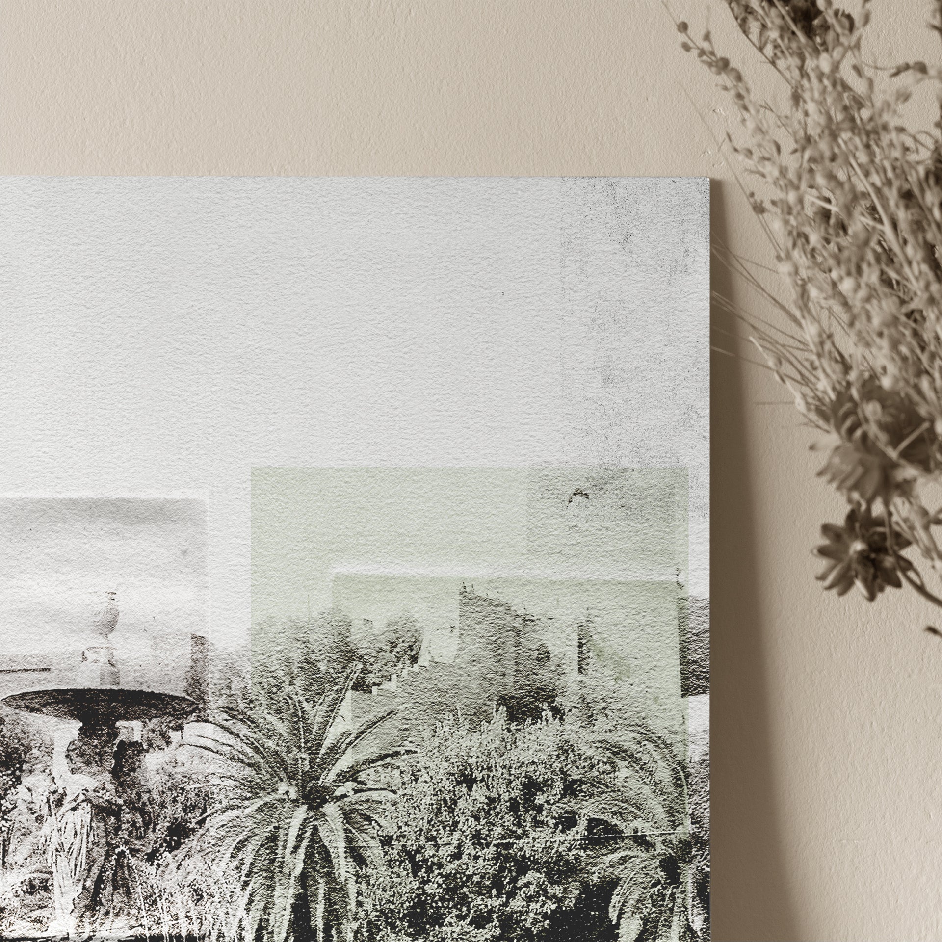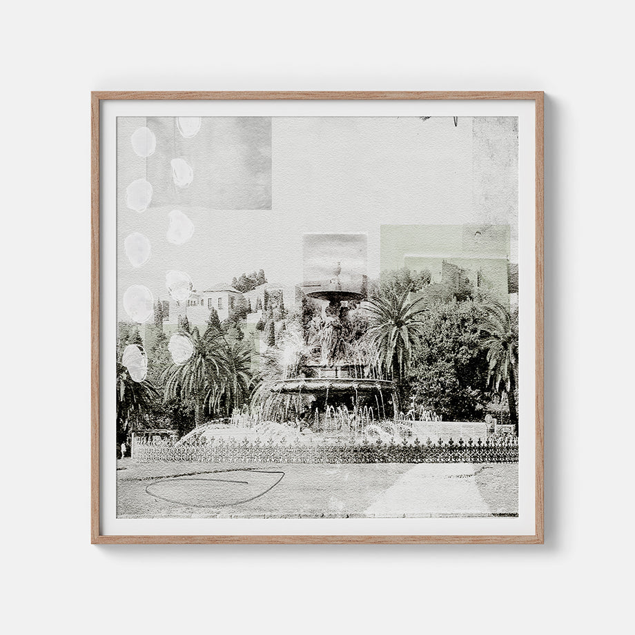 Arte de Málaga. Este cuadro presenta la fuente de las tres Gracias de Málaga. Una mezcla de fotografía y pintura con una paleta monocromática en tonos de gris y verde, La fuente destaca por sus múltiples niveles se convierte en el foco central de la composición, atrayendo la mirada con su elegancia y detalle.