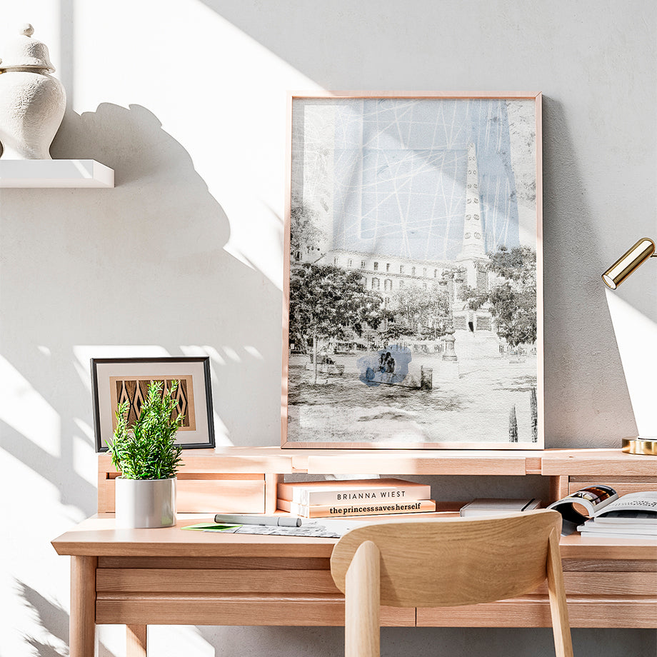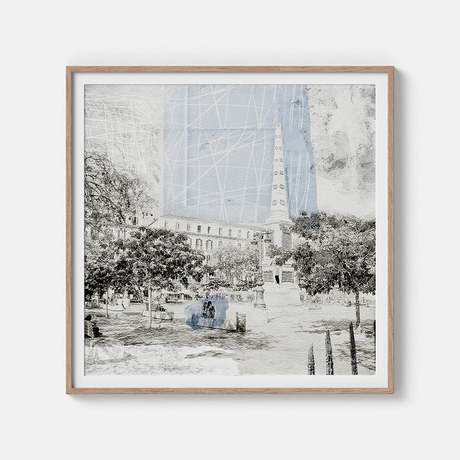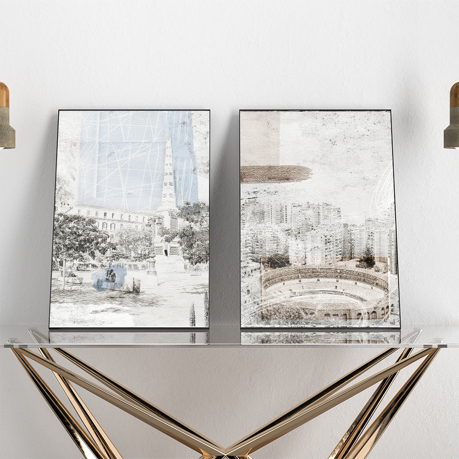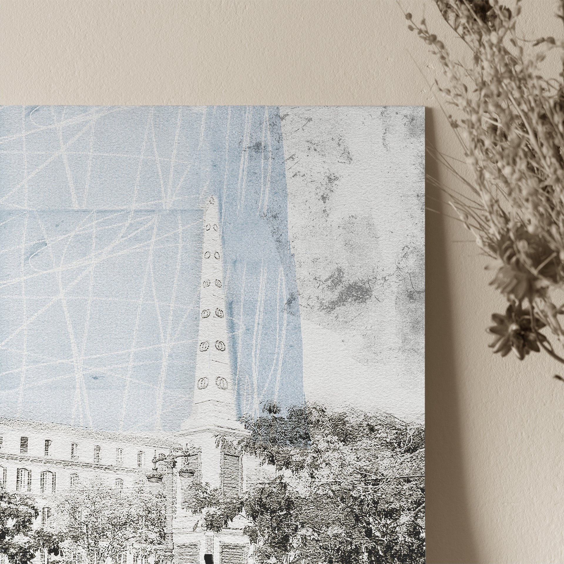 Arte de Málaga. Este cuadro presenta la plaza de la Merced de Málaga. Una mezcla de fotografía y pintura con una paleta monocromática en tonos de gris y azul. Las áreas texturizadas y los patrones abstractos, junto con un sombreado azul claro, aportan una dimensión artística que realza la belleza de la obra.