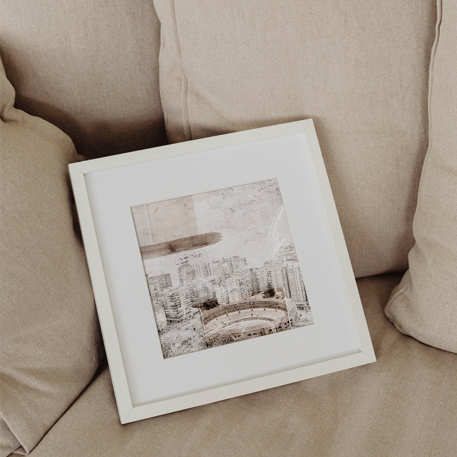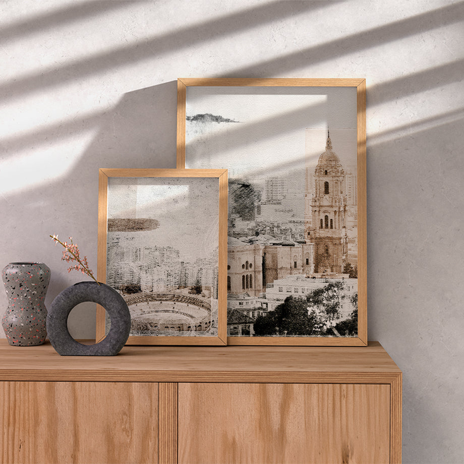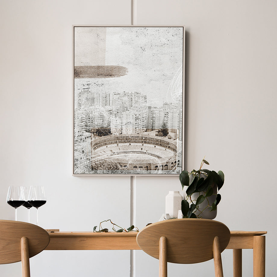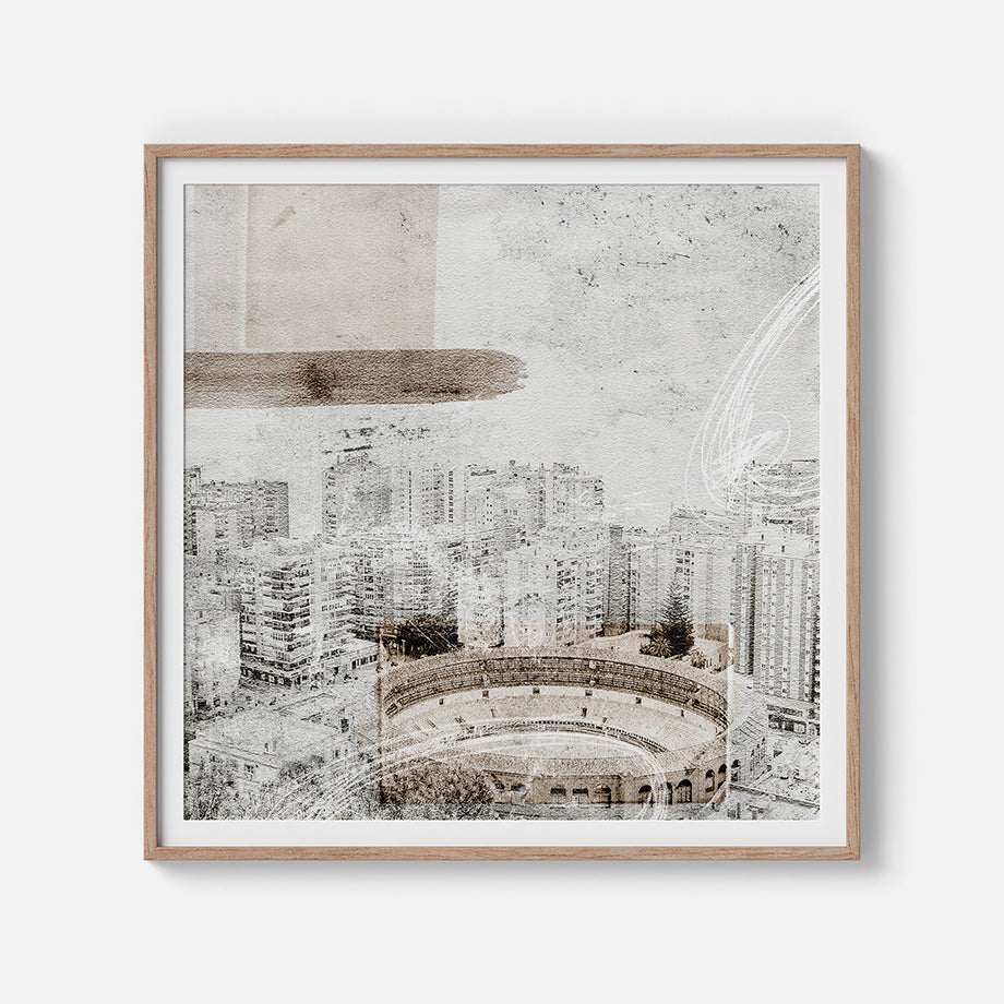 Arte de Málaga. Este cuadro presenta la Plaza de toros de Málaga. Una mezcla de fotografía y pintura con una paleta monocromática en tonos de gris y sepia.
