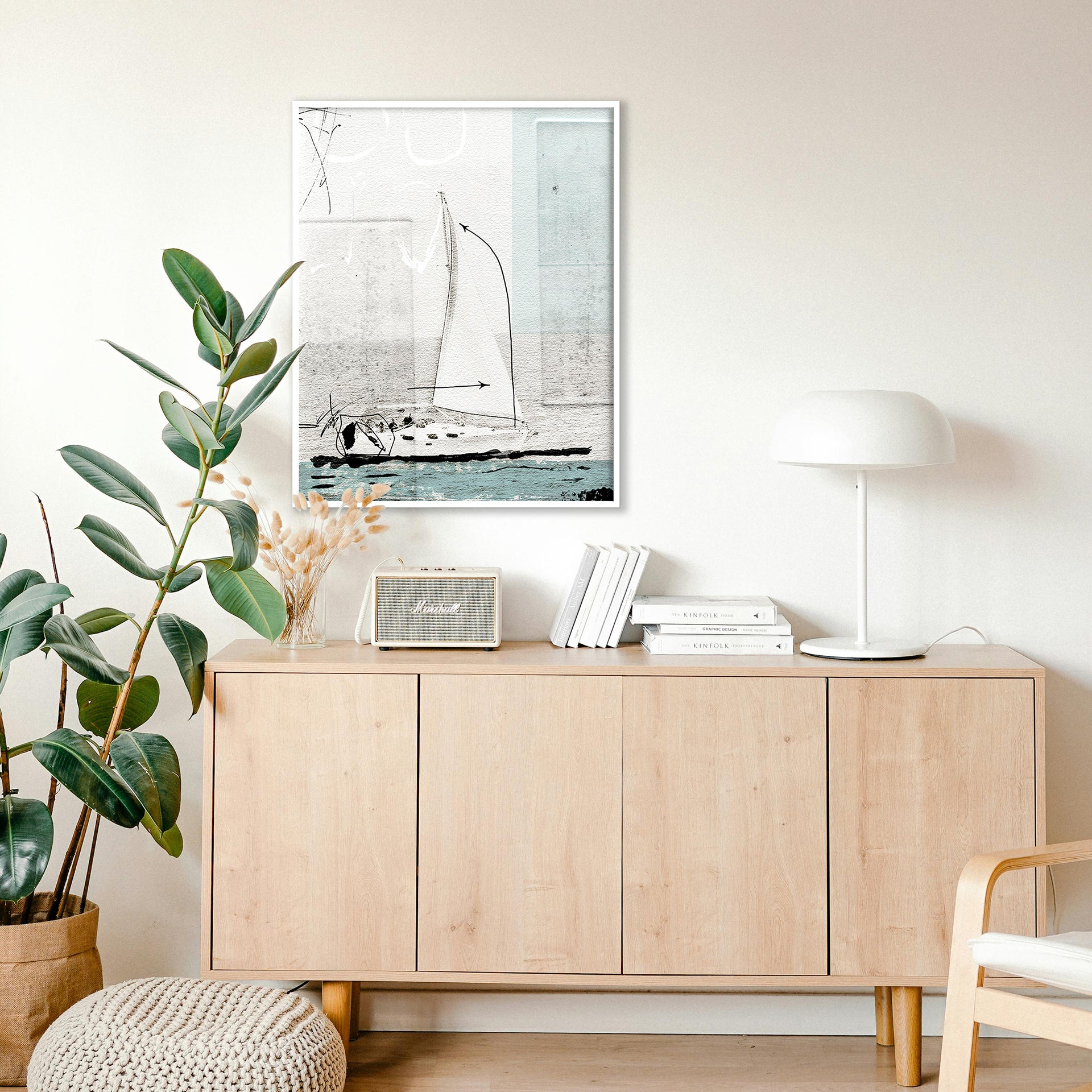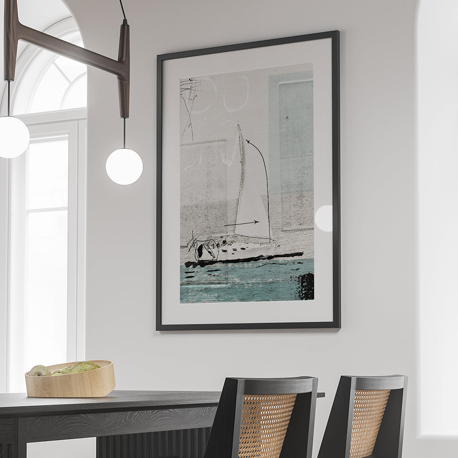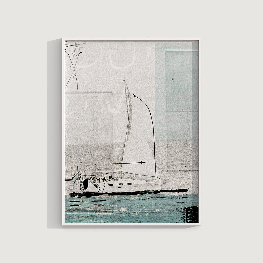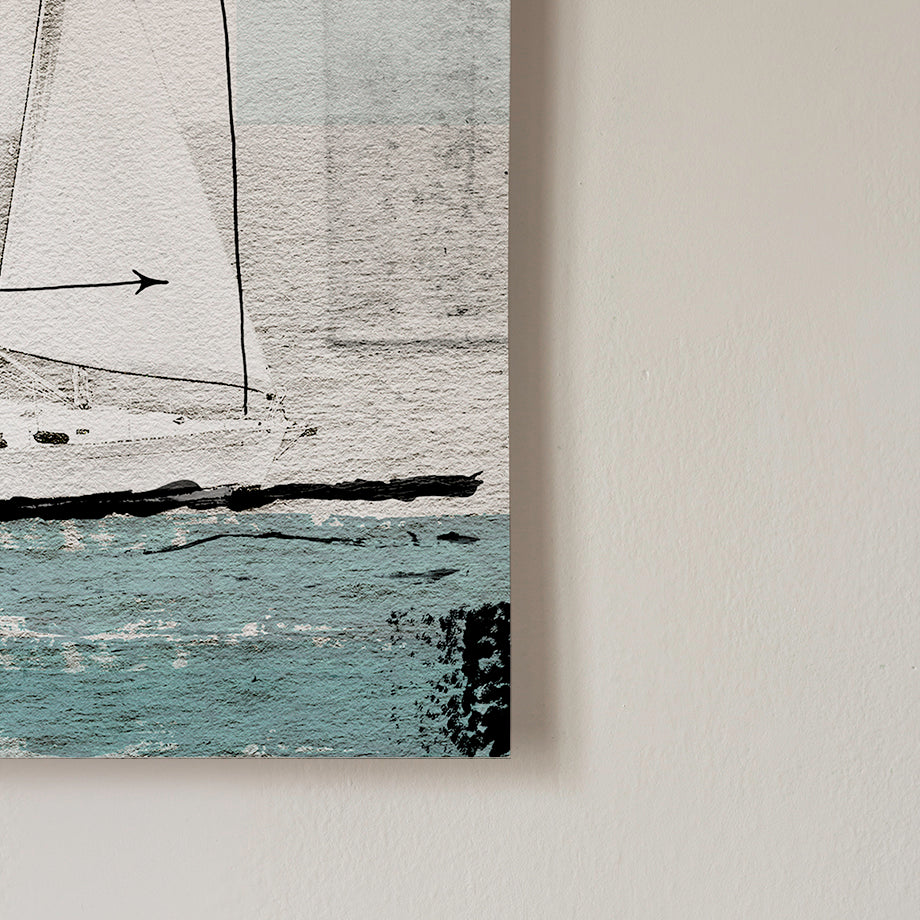 Este cuadro único y moderno presenta una interpretación artística de un barco de vela navegando. El barco, con su majestuoso mástil, destacando en un mar de líneas y formas abstractas que aportan un efecto de capas y textura al conjunto. El fondo del cuadro, con elementos abstractos y líneas fluidas, añade profundidad y dinamismo.