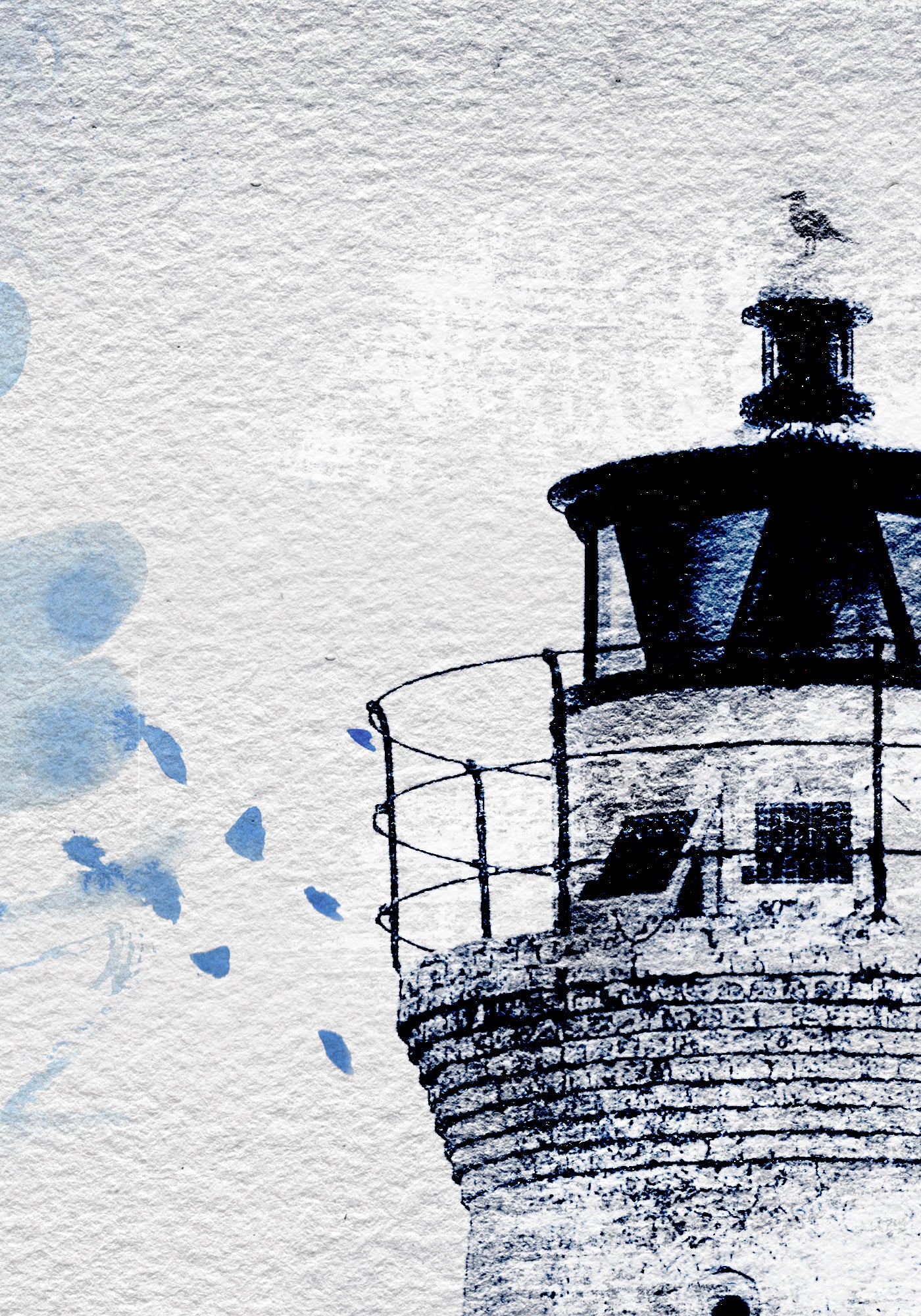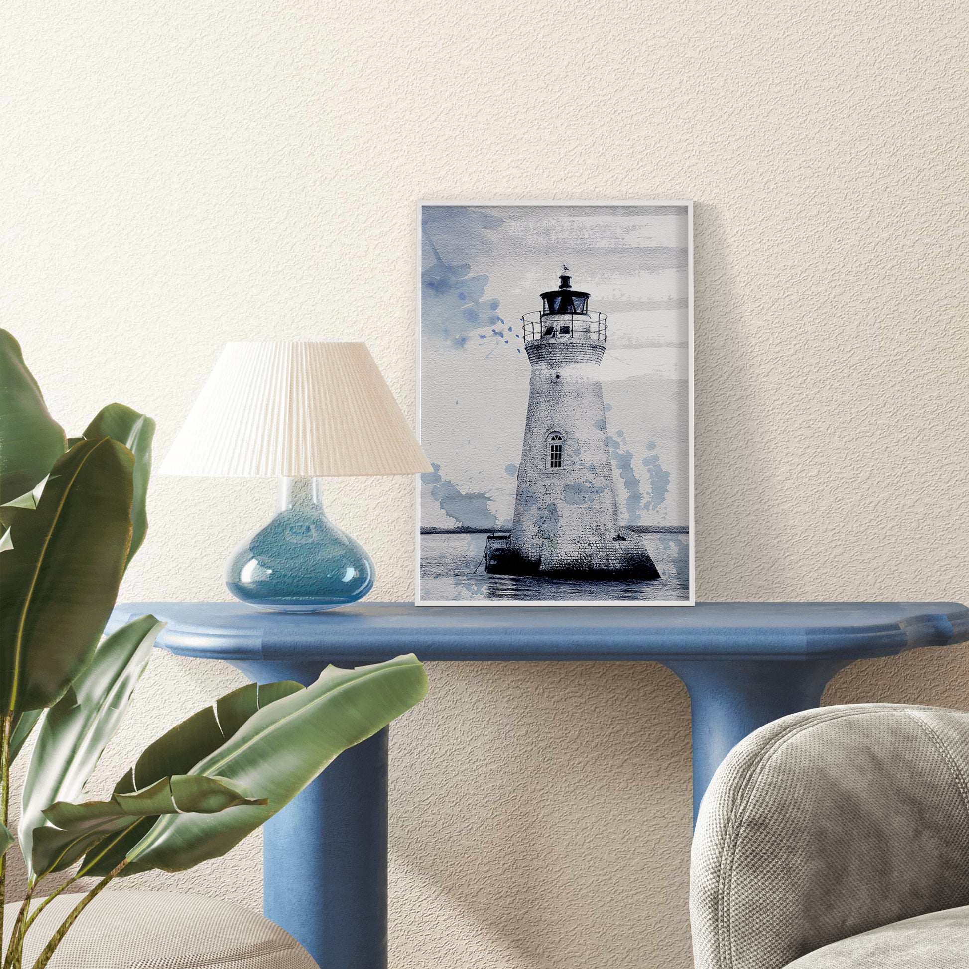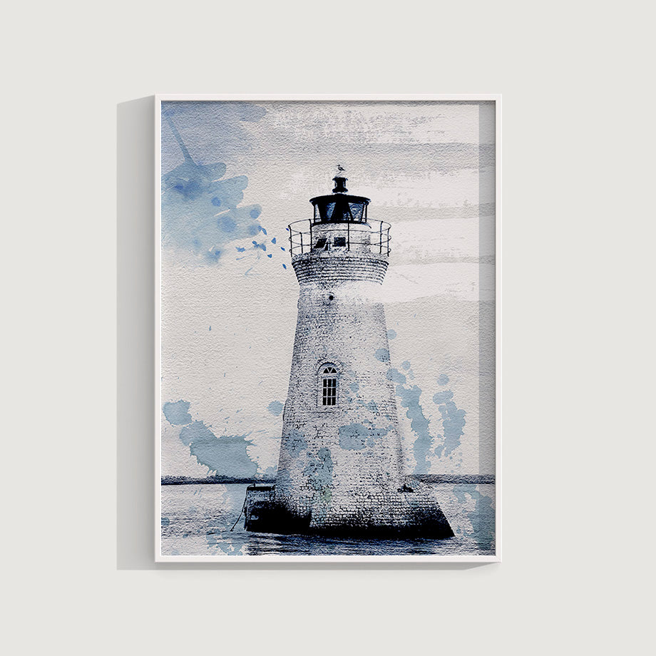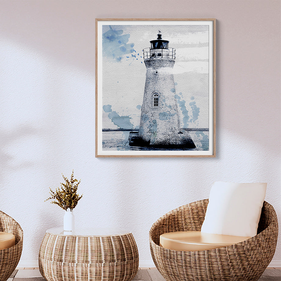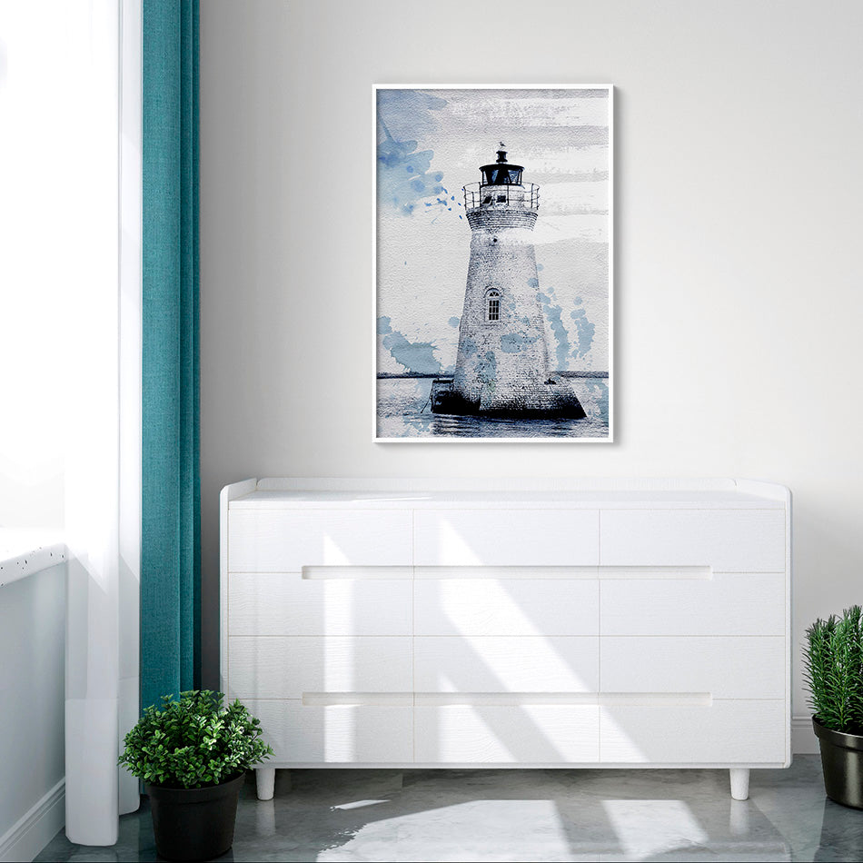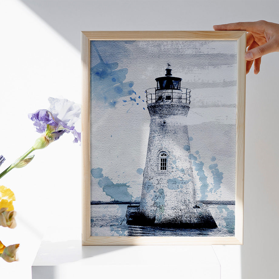 Este cuadro único y moderno presenta una interpretación artística de un Faro. El paisaje marino con los tonos azules aportan un efecto de capas y textura al conjunto. El fondo del cuadro, con elementos abstractos y líneas fluidas, añade profundidad y dinamismo.