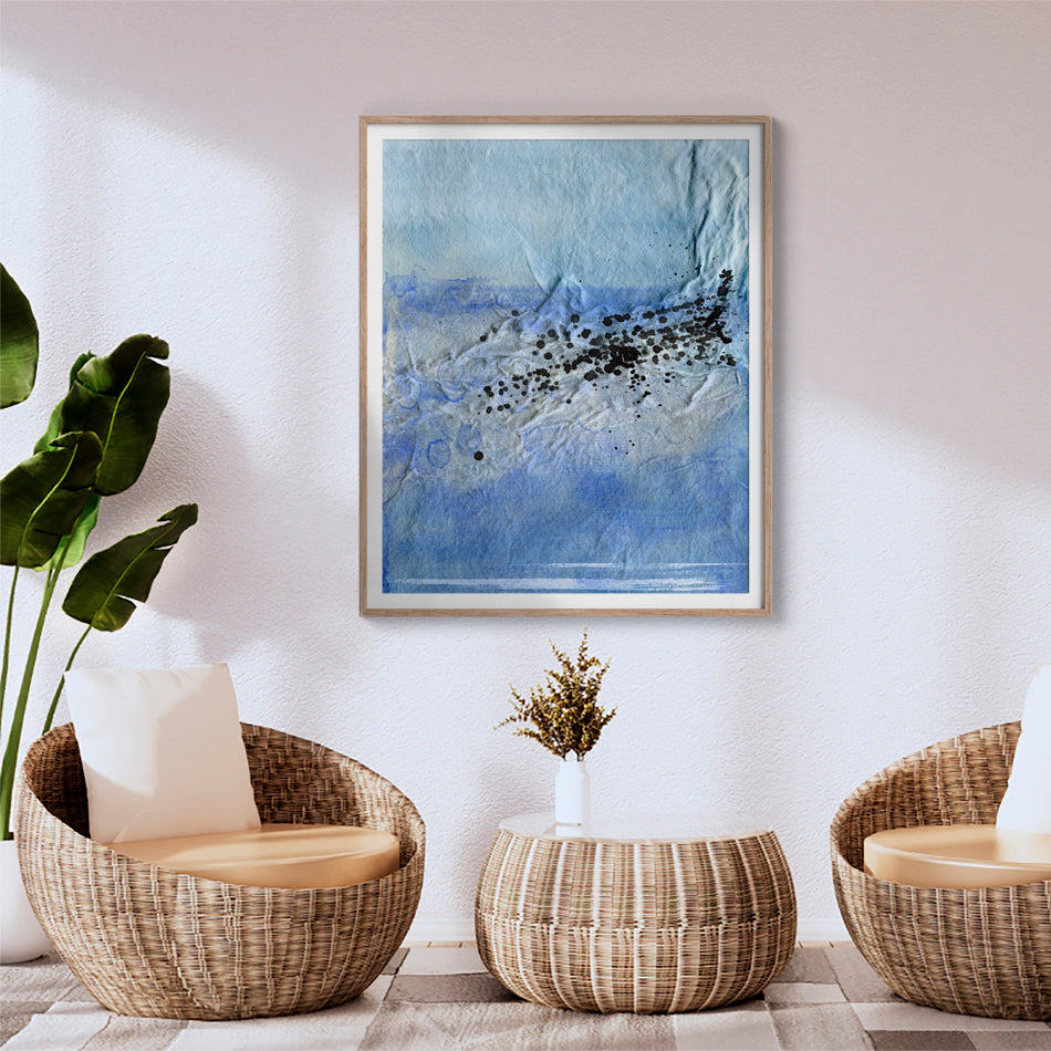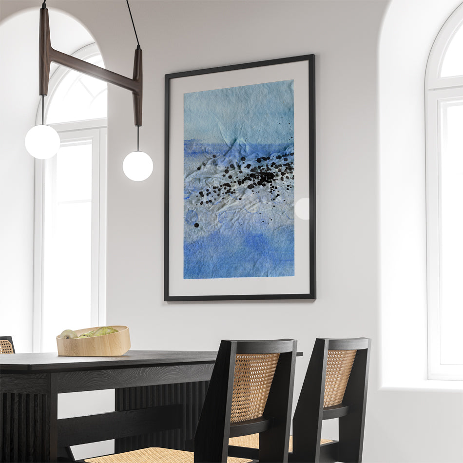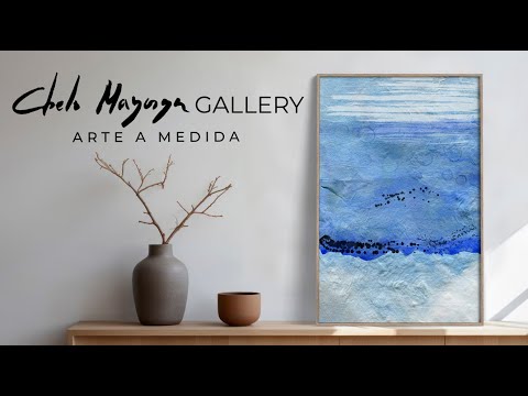 “Océano II" es una obra abstracta que evoca la inmensidad y la calma del mar. Las capas de azul, desde los tonos más etéreos hasta los más intensos, se entrelazan como corrientes marinas, mientras los pliegues del papel artesanal aportan una dimensión orgánica que recuerda al vaivén de las olas.