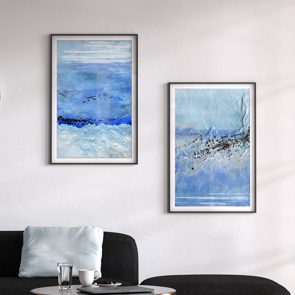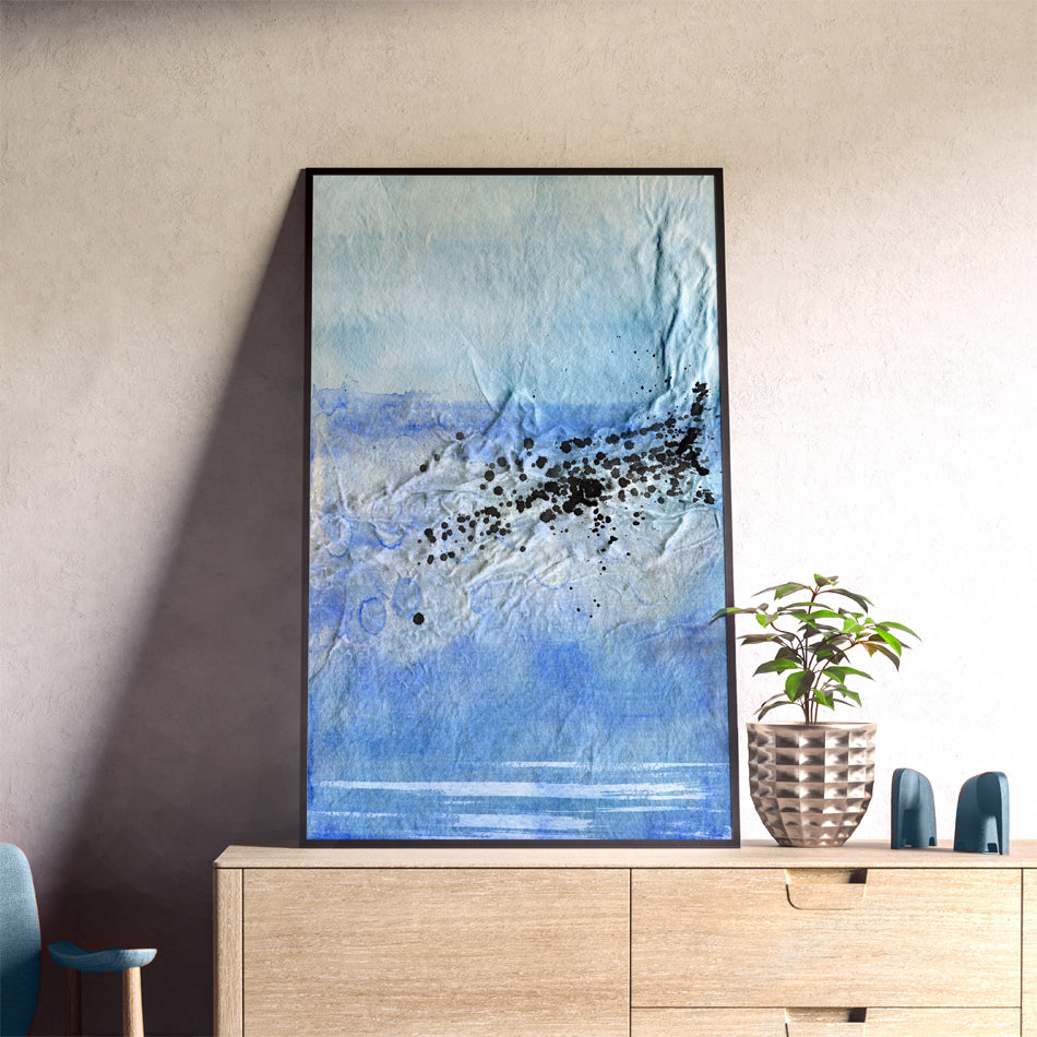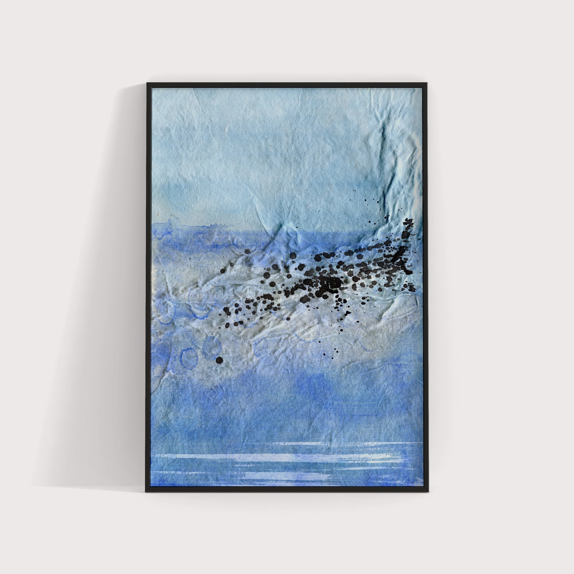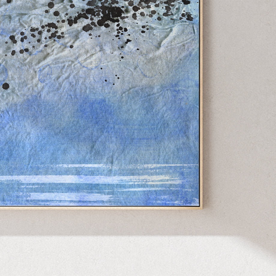 Una diagonal de tinta negra atraviesa la composición como una corriente inesperada, un gesto audaz que rompe la serenidad y añade tensión visual, como si el océano revelara su fuerza contenida.