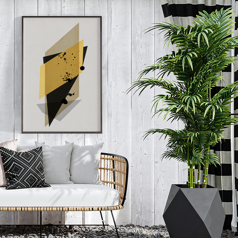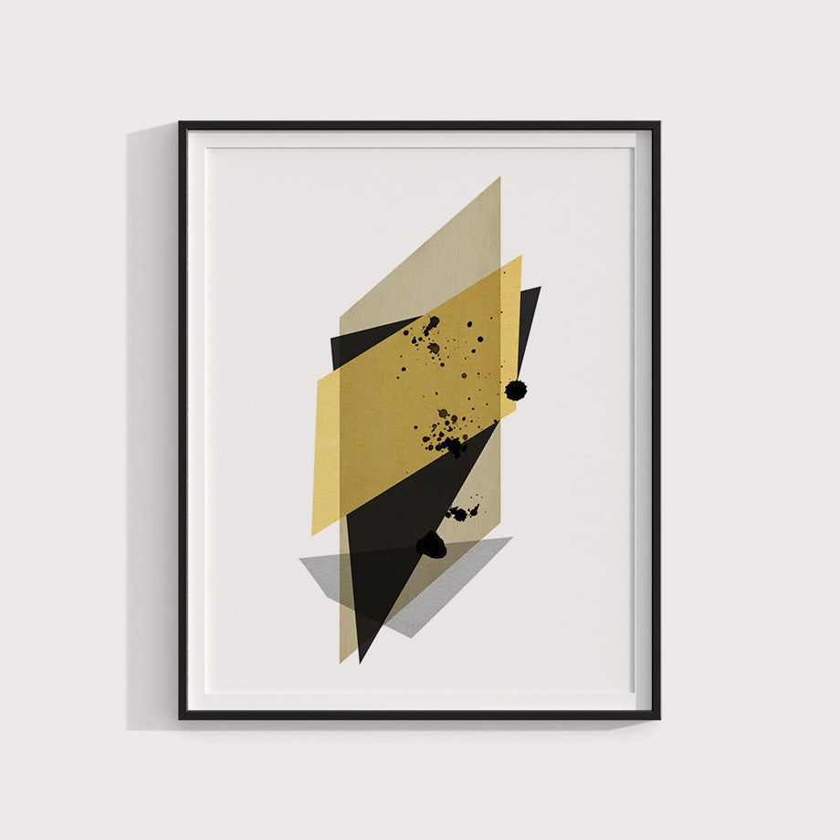 La precisión geométrica de formas minimalistas en colores amarillo, gris y negro. Las formas geométricas se superponen creando un efecto de capas con trasparencias. Las salpicaduras negras sobre las formas aportan un elemento orgánico y texturizado que contrasta con la estructura precisa de las figuras geométricas.