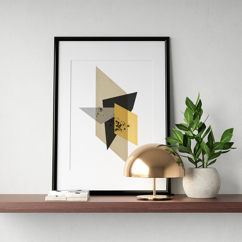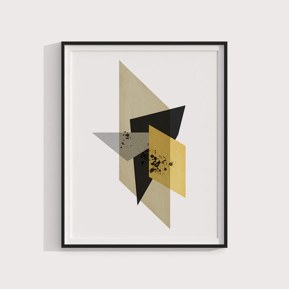 La precisión geométrica de formas minimalistas en colores amarillo, gris y negro. Las formas geométricas se superponen creando un efecto de capas con trasparencias. Las salpicaduras negras sobre las formas aportan un elemento orgánico y texturizado que contrasta con la estructura precisa de las figuras geométricas.