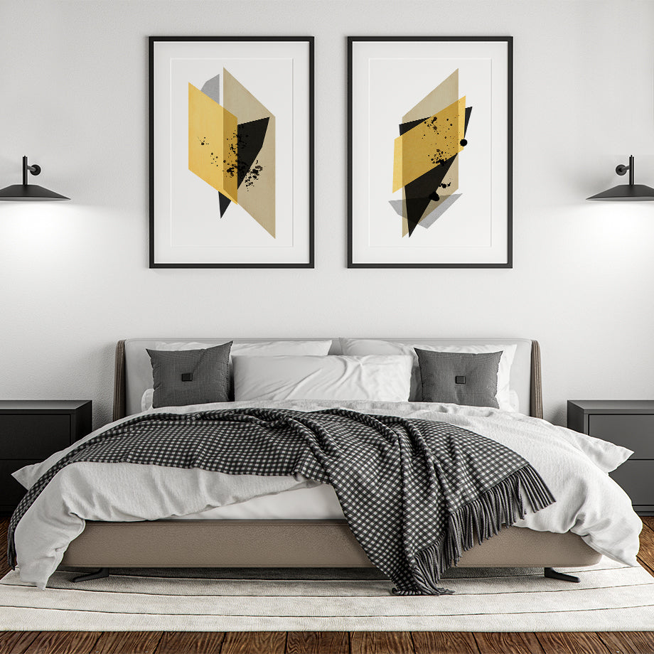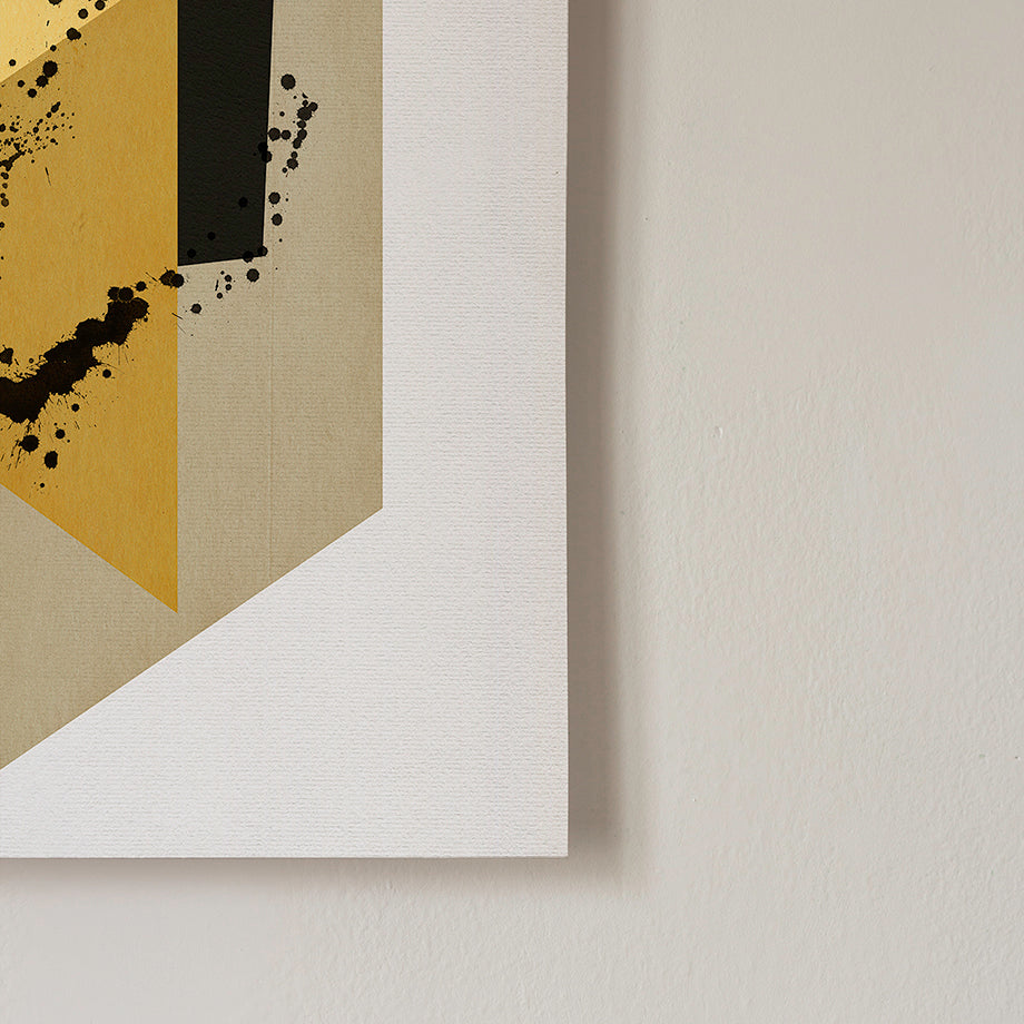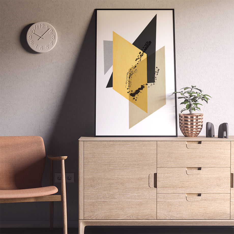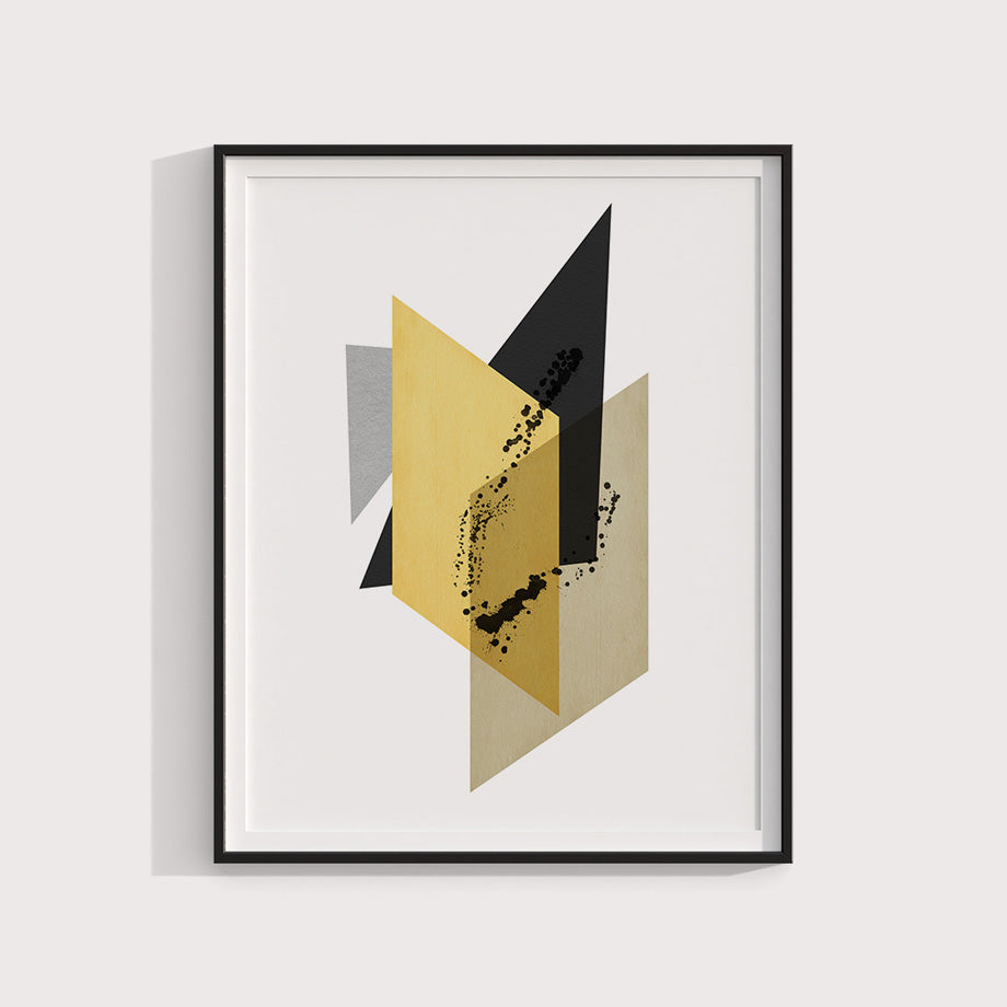 La precisión geométrica de formas minimalistas en colores amarillo, gris y negro. Las formas geométricas se superponen creando un efecto de capas con trasparencias. Las salpicaduras negras sobre las formas aportan un elemento orgánico y texturizado que contrasta con la estructura precisa de las figuras geométricas.