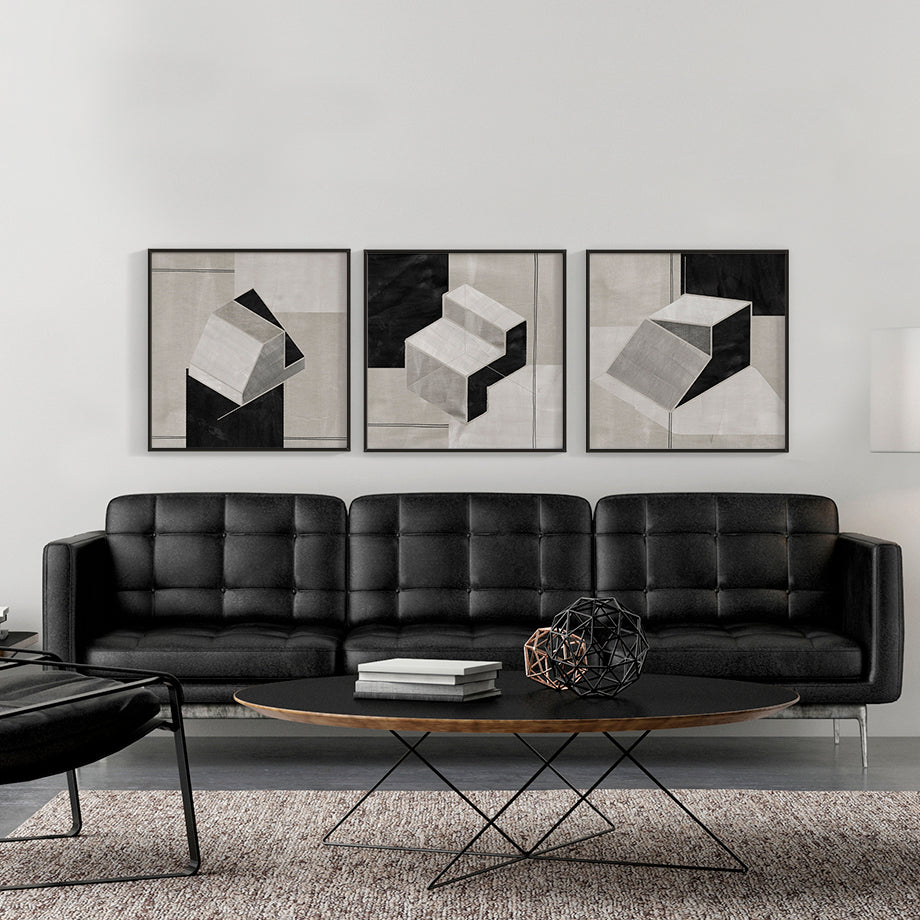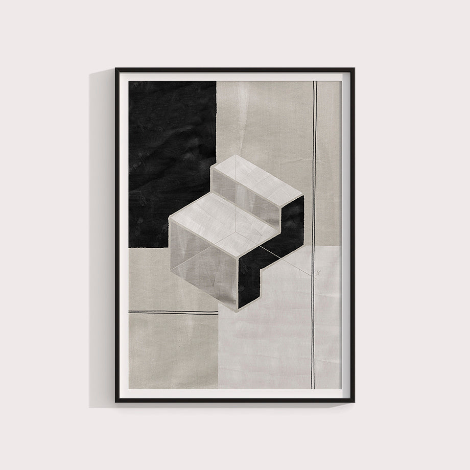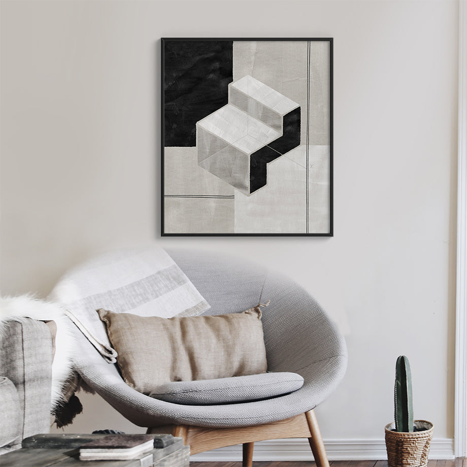 Este cuadro abstracto presenta un diseño geométrico moderno y sofisticado que juega con la percepción de profundidad y forma. La pieza central del cuadro es una estructura escalonada tridimensional que parece flotar sobre un fondo compuesto de diversas tonalidades de negro, gris y blanco.