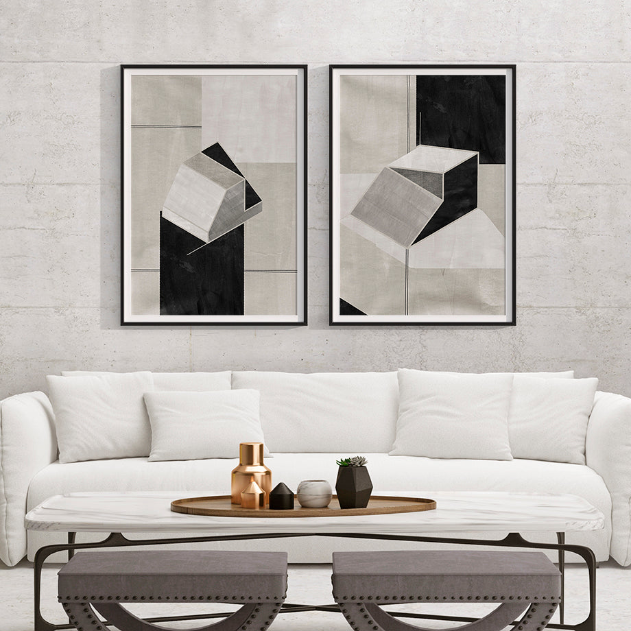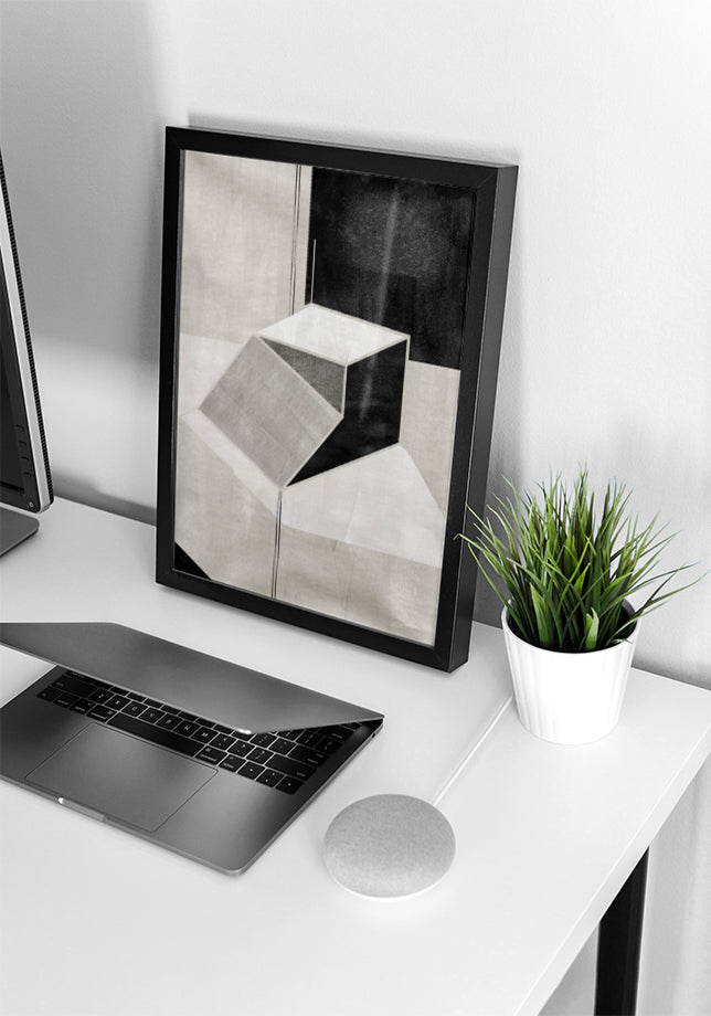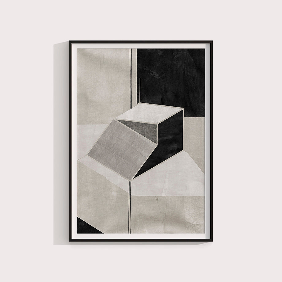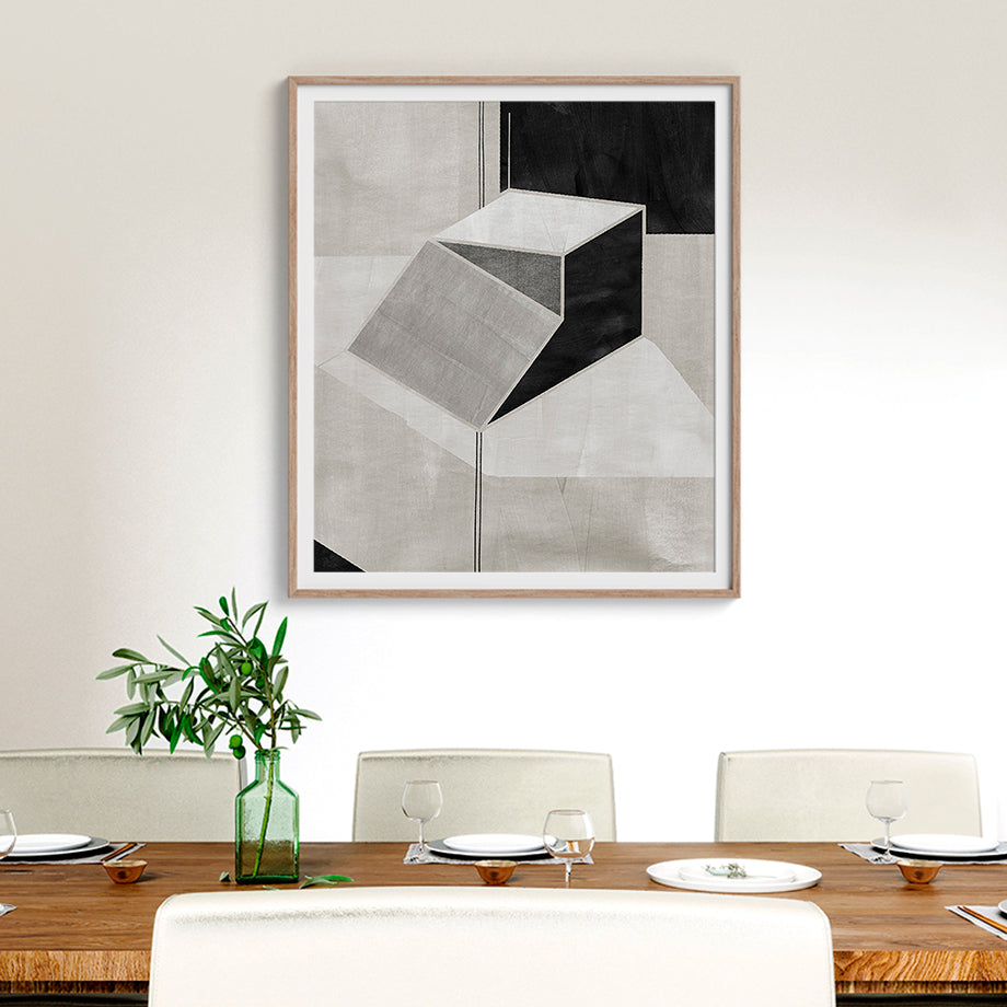 Este cuadro abstracto presenta un diseño geométrico moderno y sofisticado que juega con la percepción de profundidad y forma. La pieza central del cuadro es una estructura escalonada tridimensional que parece flotar sobre un fondo compuesto de diversas tonalidades de negro, gris y blanco.