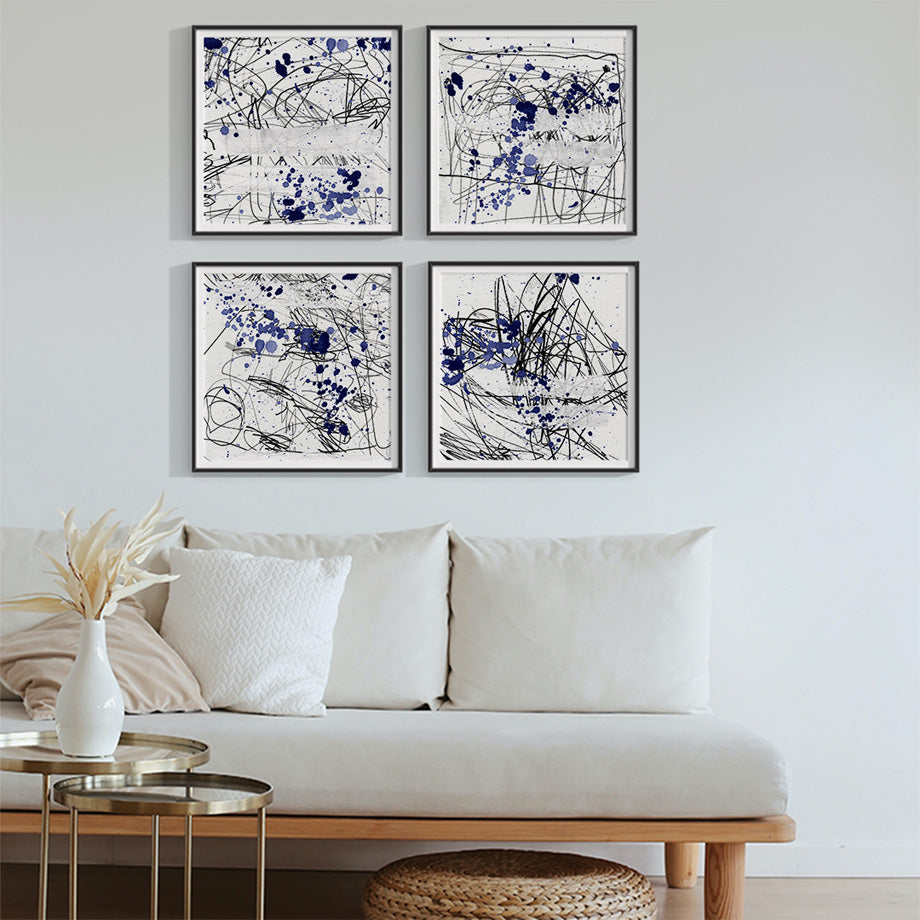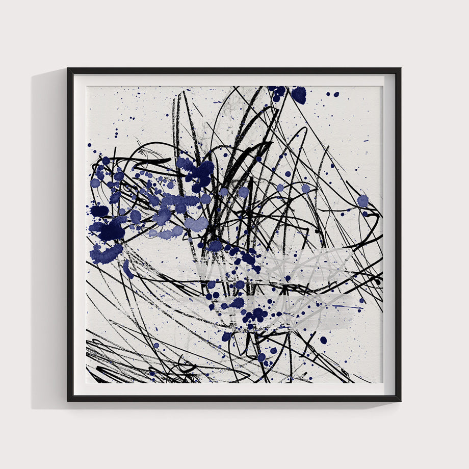 Este cuadro abstracto es una vibrante mezcla de espontaneidad, sobre un lienzo blanco, una red de garabatos negros se extiende en un patrón aparentemente caótico pero intencionado, intercalados entre los trazos negros, salpicaduras de pintura azul, creando una sensación de movimiento y energía.