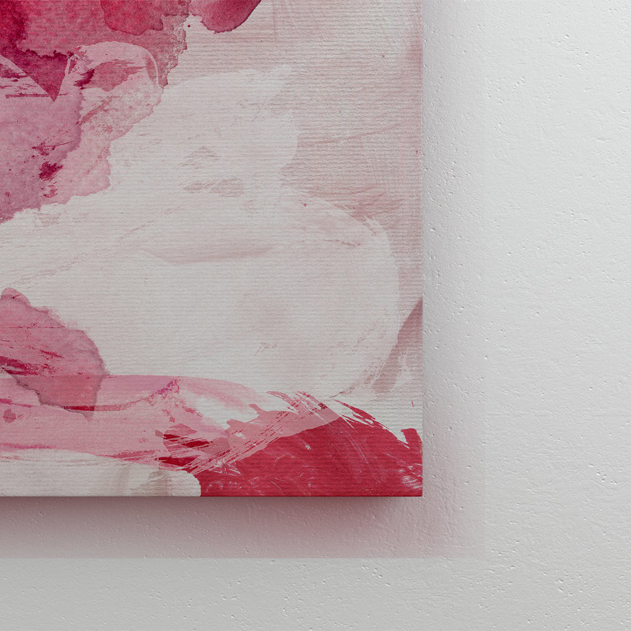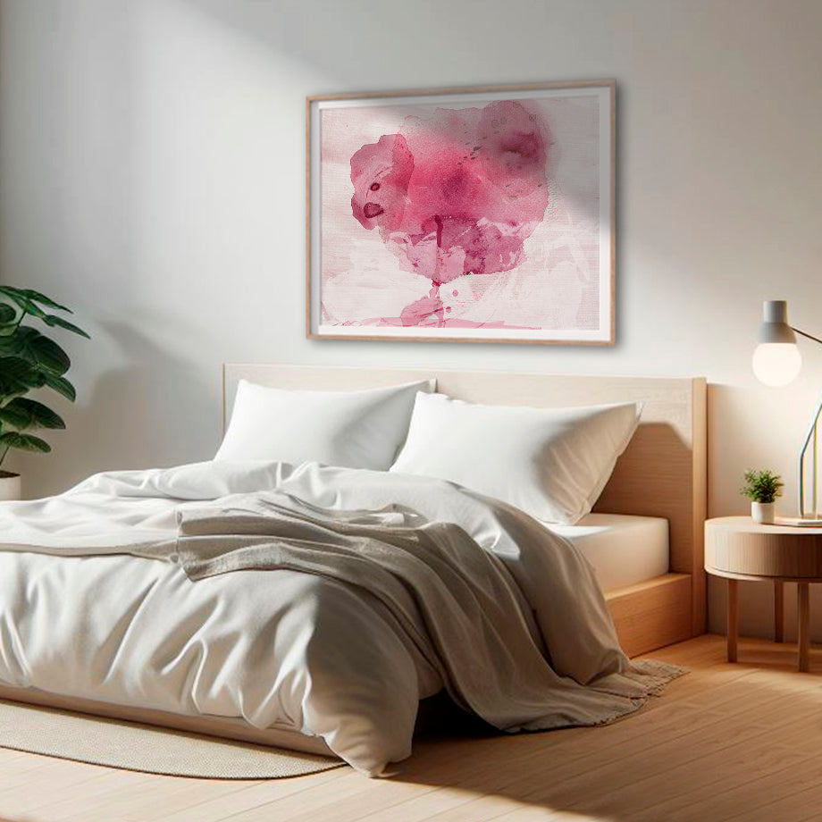 Este cuadro abstracto en acuarela presenta una vibrante mezcla de tonos rosas y rojos que capturan la esencia de una flor en plena explosión de color. El fondo es un suave rosa pastel con sutiles trazos de blanco y rosa claro, añadiendo profundidad y textura sin restar protagonismo a la vibrante explosión central