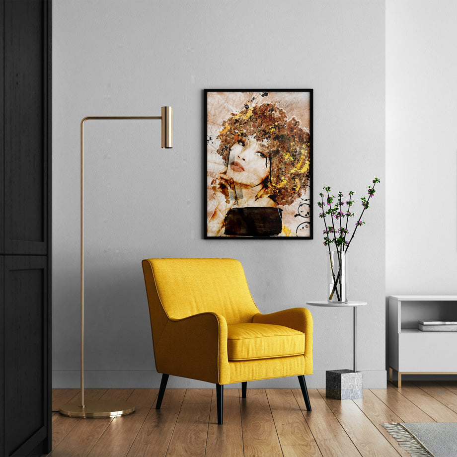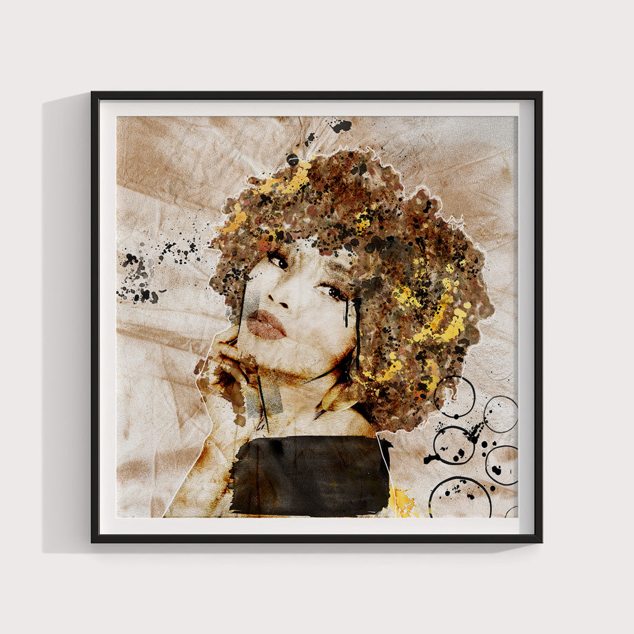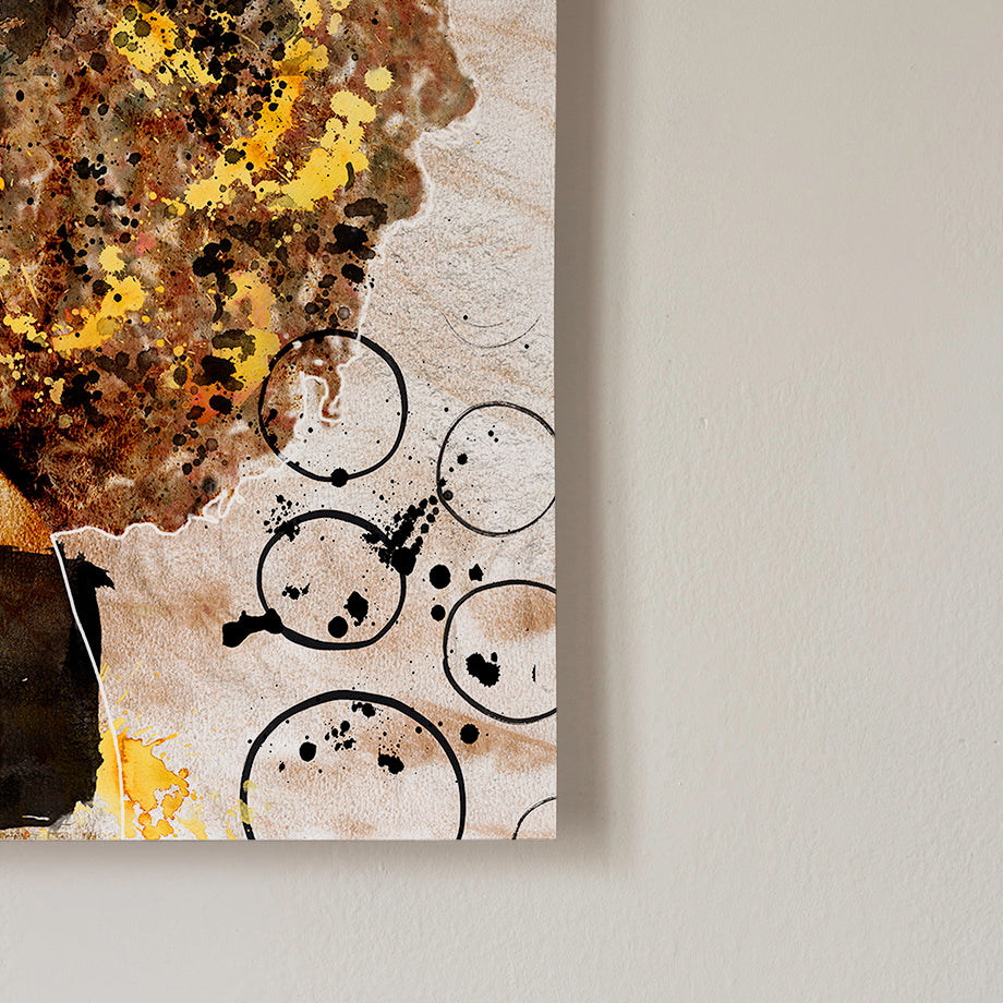Mujer compuesta por una paleta de colores en tonos negros, marrones y amarillos, fondo con texturas, salpicado con manchas llena de expresividad.