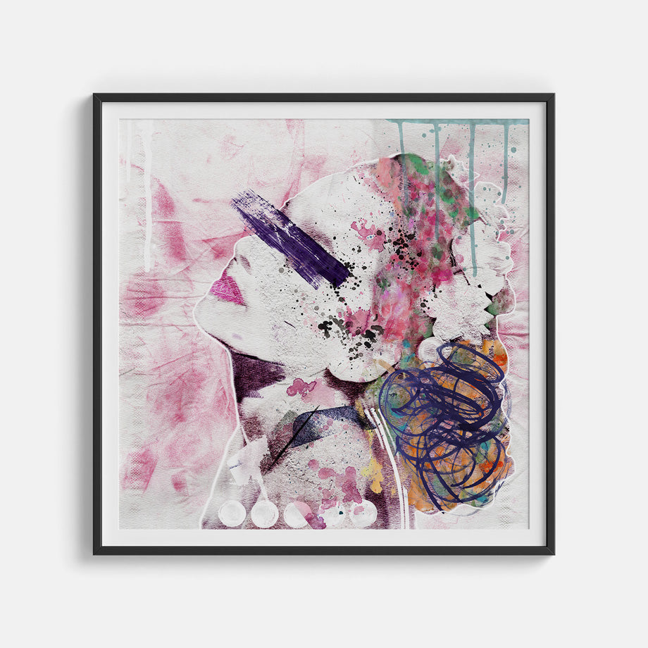 Mujer compuesta por una vibrante paleta de colores, sus ojos están ocultos tras un atrevido trazo horizontal en color púrpura, que añade un toque de misterio a la composición, llena de trazos que aportan textura y dinamismo.